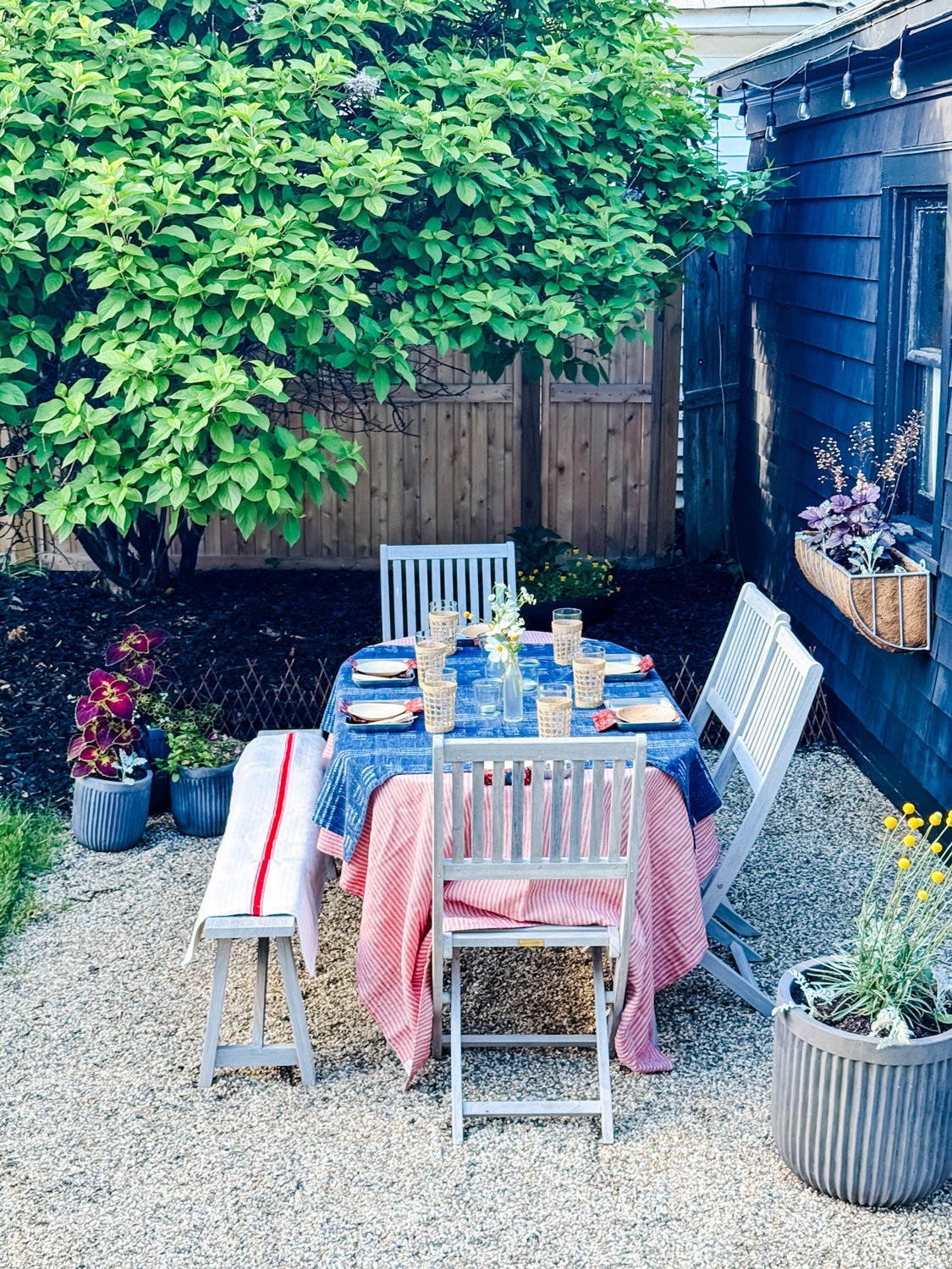 I used a collection of linens that I’ve used many times, but when put all together, the red, white & blue work perfectly. The linen tablecloth I used at the holidays (you can see it in this post), and now topped with an indigo table throw, and a vintage grain sack from Our French Finds, we have a fun Fourth of July table!