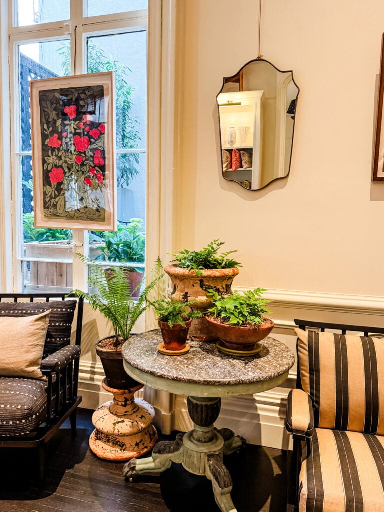 Today, for Sunday favorites with Mary Ann and Cindy, I thought I would share a visit to a beautiful shop and design studio in New York City. Walking into Nikki Kehoe feels like discovering a world where restraint meets romance. Every detail—whether it’s a potted plant with wood chips covering the soil, or art hung in a window—tells a story of quiet luxury. It’s simplicity with just enough intrigue to make you take a closer look.