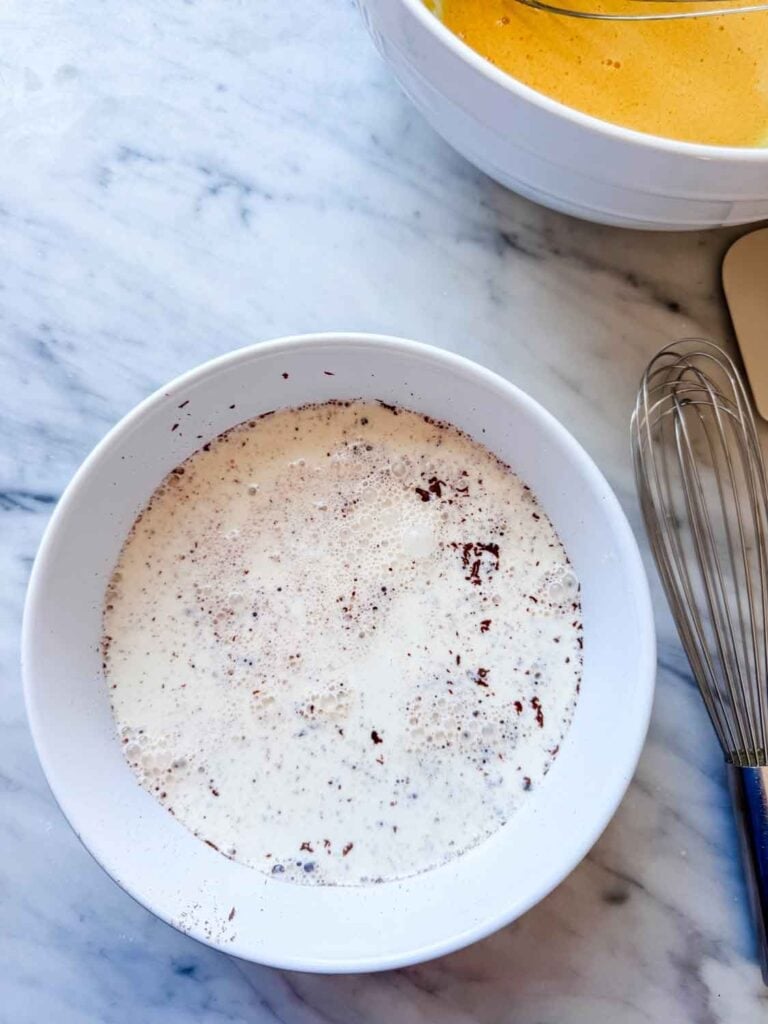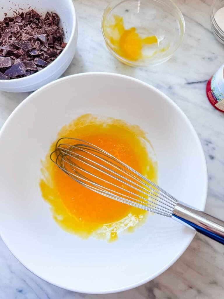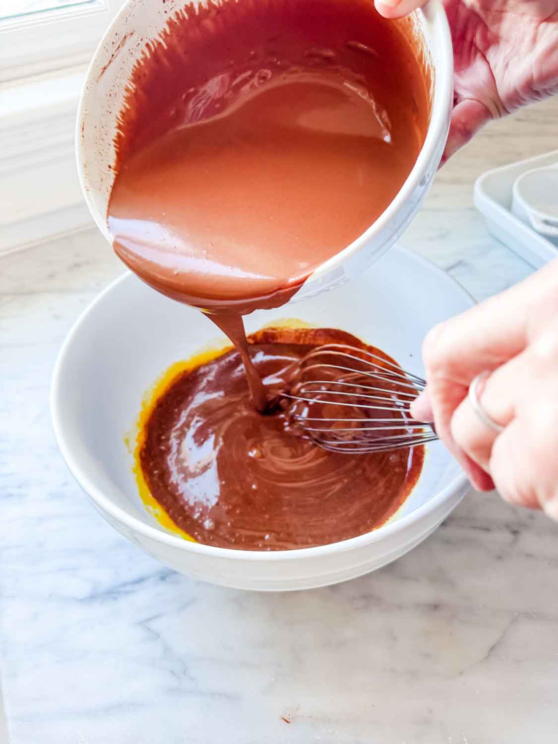 - Slowly add the chocolate mixture to the egg mixture. Whisk gently to combine.
