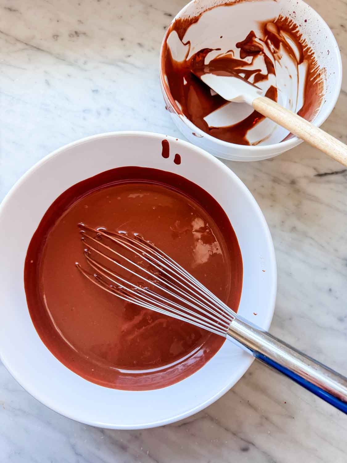 - Allow to sit for a moment for the chocolate to begin to melt, then slowly whisk until completely combined.