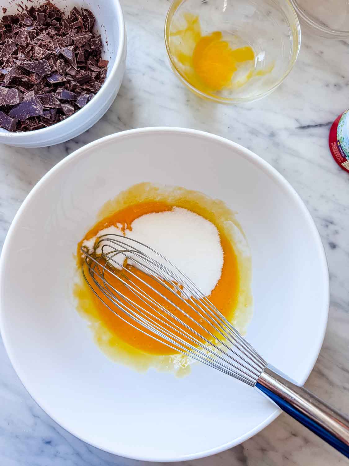 - In a large bowl, whisk the egg yolks, then whisk in the sugar.