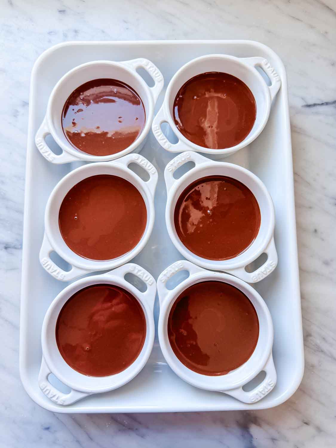 - Place six individual ramekins or cups in a baking dish with sides, and divide the chocolate mixture among them.