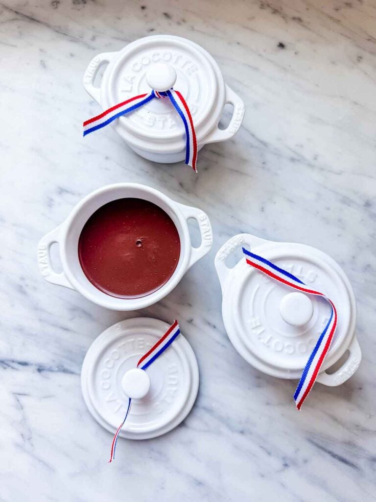 I added a little French-inspired ribbon to each lid. It’s the same ribbon I use for SHOP MOST LOVELY THINGS. This dessert is rich and creamy, and served this way, it was a big hit! If you don’t have individual pots, you could make them in ramekins or in little French cups like Duralex Picardie glasses. Pot de Crème is baked at a fairly low temperature, and in a water bath (bain-marie), so the tempered glass will not break.