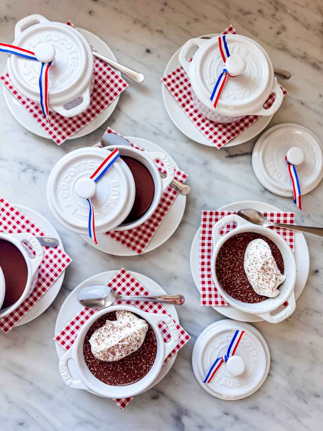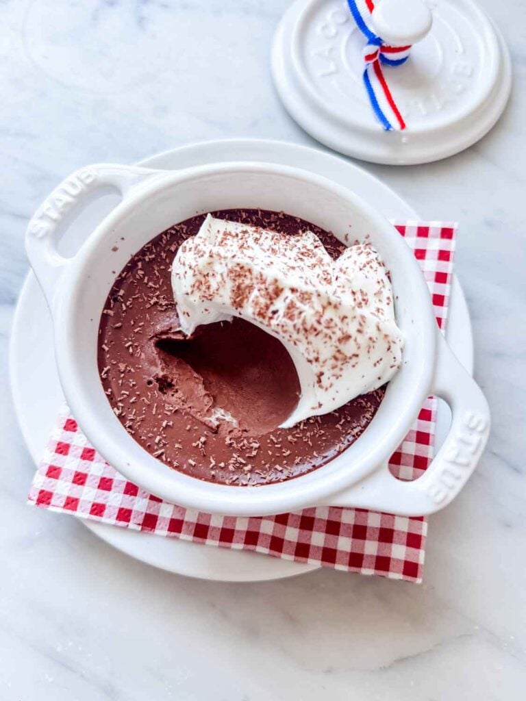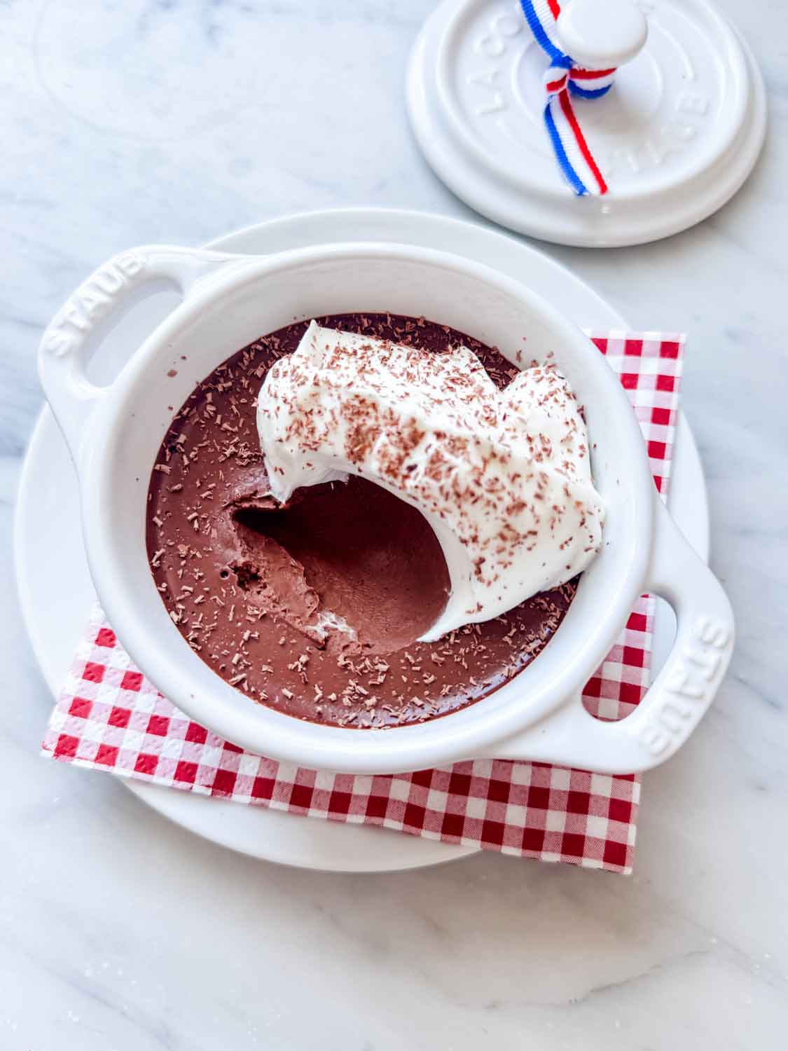 I love using individual Staub cocottes. It makes any dish or dessert just a little more special. This dessert can be made ahead, which definitely makes it a great dessert for dinner parties. Make them the day before, refrigerate them, and then make some whipped cream to add just before serving. I added a little shaved chocolate, not that it needed it, but I think it looks pretty!