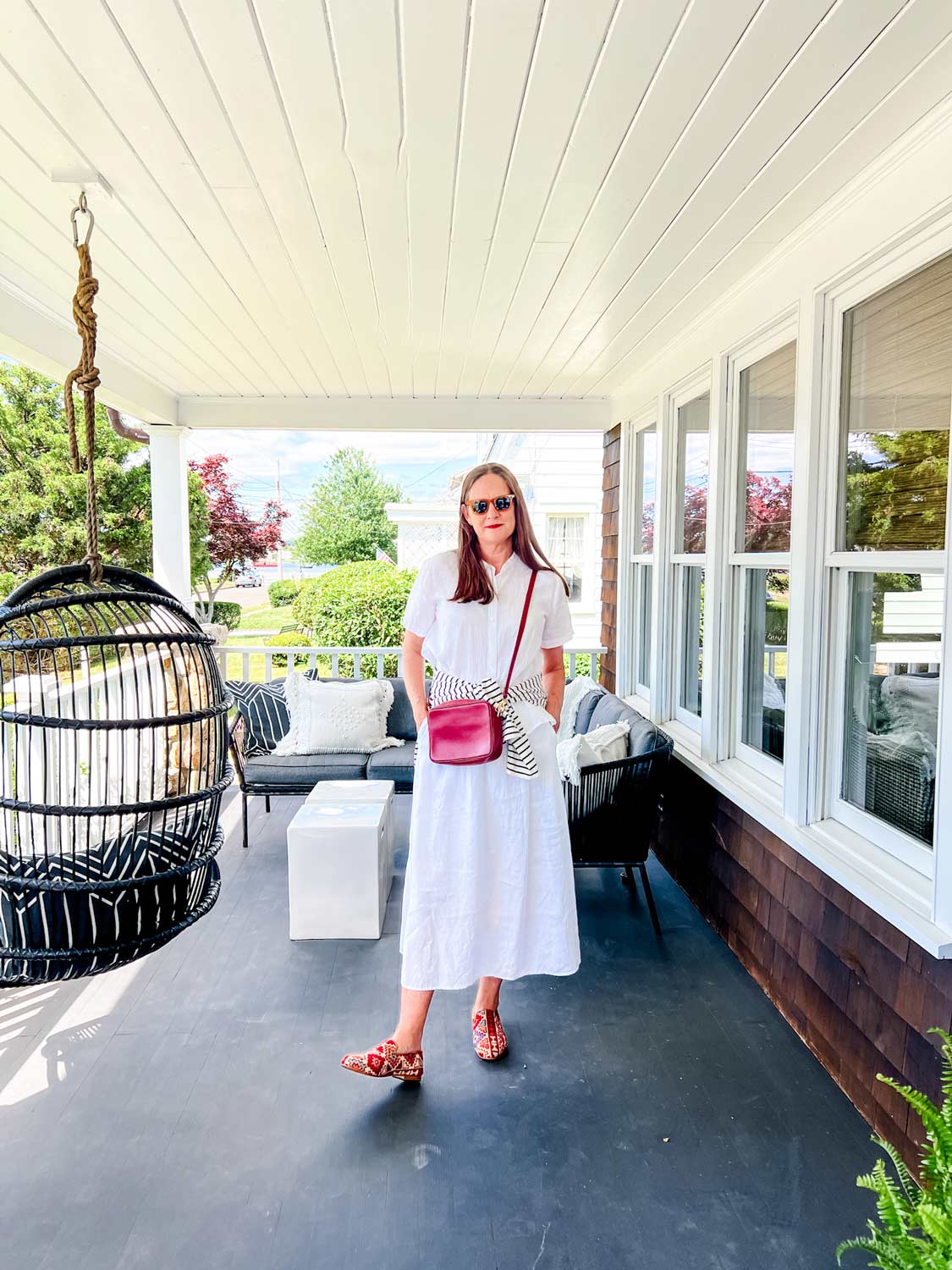 - Striped tee tucked into a white linen skirt for a fresh take on summer neutrals.