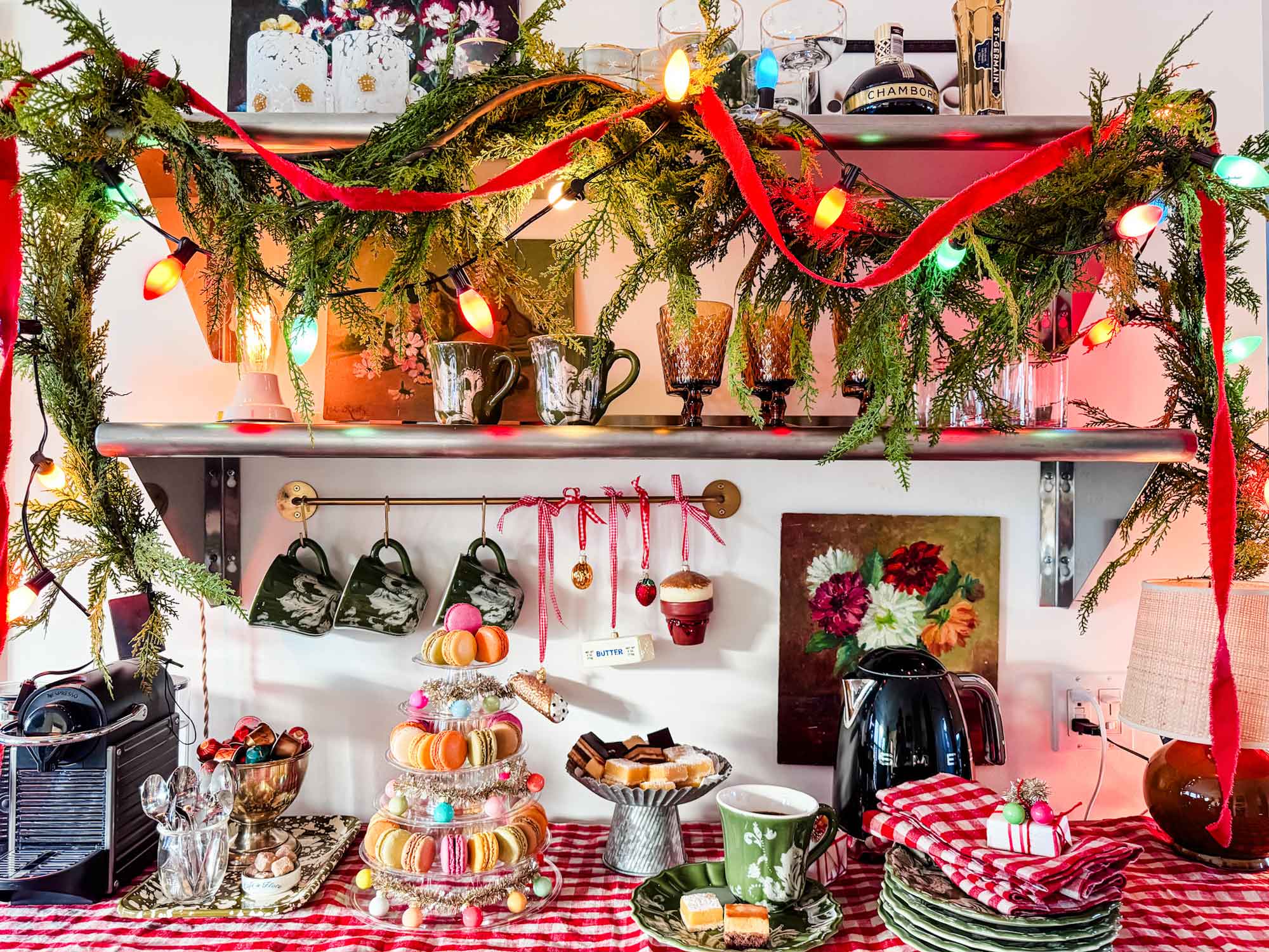 I added faux cedar garland, old-fashioned Christmas lights, and red velvet ribbon on one shelf. Under the shelf, I hung a few food-related ornaments using gingham ribbon along with the mugs. The amber glassware blends beautifully with the vintage art from Shop Most Lovely Things, which opens soon with over 100 new vintage treasures found all over Paris.