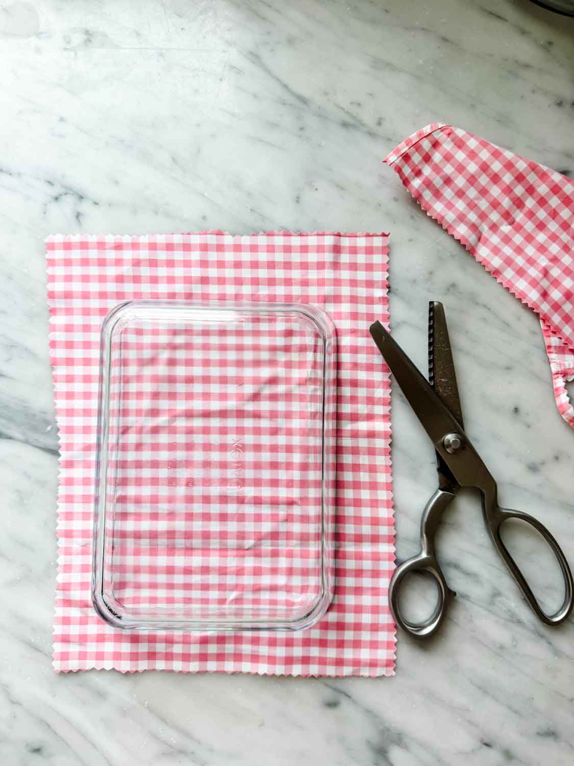 - Start with clean, 100% cotton fabric. If you’re using old shirts, wash and dry them first. Cut the fabric into your desired sizes: small squares for covering jars, medium for bowls, and larger pieces for wrapping bread or produce. Using pinking shears helps prevent fraying around the edges, but regular scissors work just fine, too.