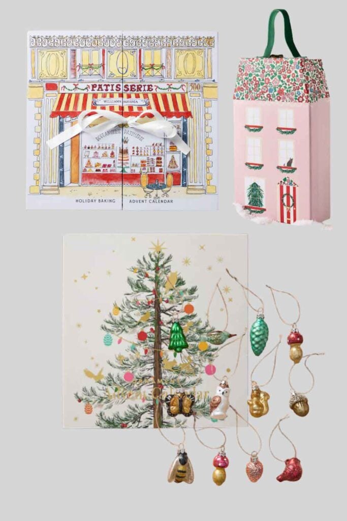 Middle: Williams Sonoma 24 Days of Baking Cookies Advent Calendar // Meri Meri Liberty Charm Bracelet Advent Calendar // Woodland Ornament Advent Calendar