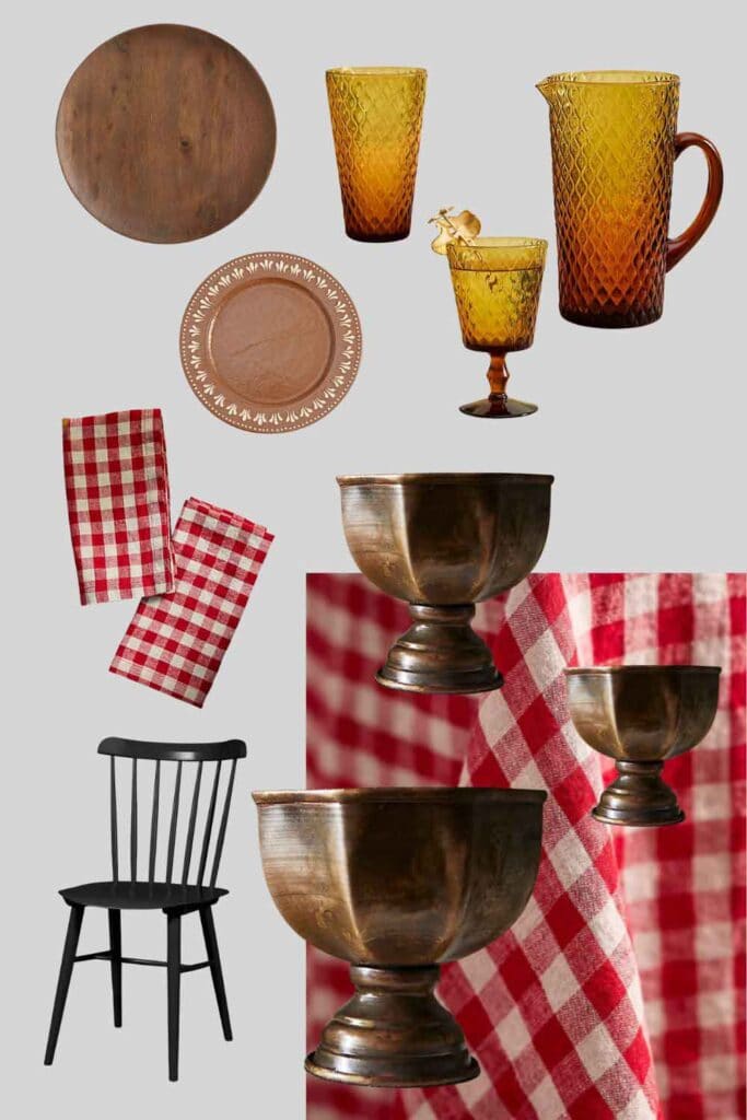 Antique iron vases (currently sold out, similar to this set) // Stripe Linen Tablecloth/ Gingham Napkins // Amber Glass Goblets, Pitcher and Tumblers // Wood Plates // Brown plates // Pendant Light // Enzo Mari Apple Pear poster // Salt Chair or Carter Chair