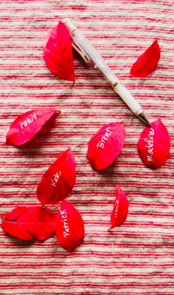Using beautiful red leaves from a Burning Bush plant, I wrote everyone’s name with a white gel marker.