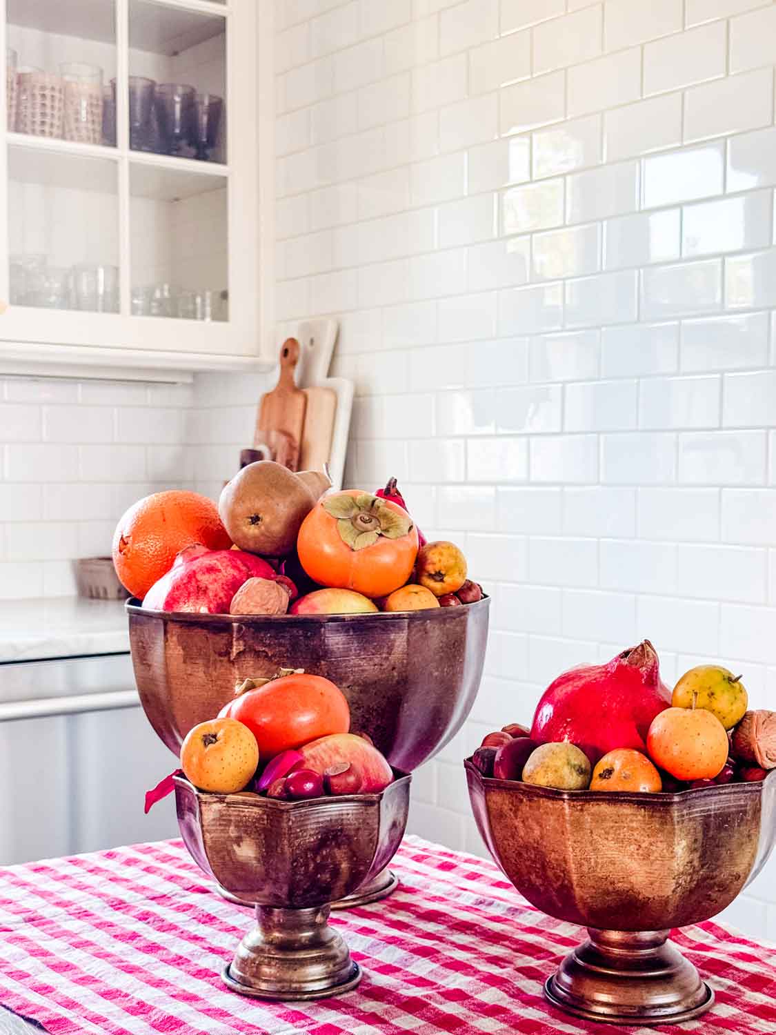 Choose 2-3 vases in varying heights. The gold finish adds warmth, but I have made these using all white bowls in different sizes. The fruit looks beautiful in anything, really! You could use baskets or wood bowls.