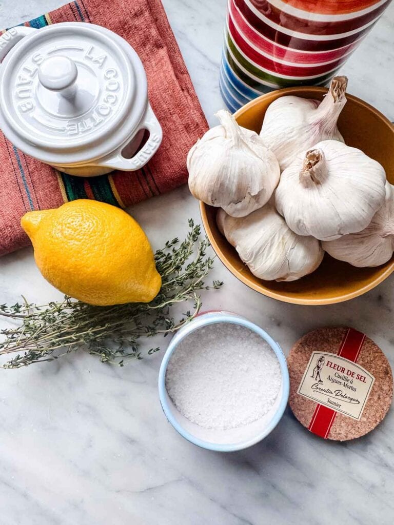 It’s made in a small Staub cocotte (or any small ovenproof dish you have), with just a few ingredients: whole garlic cloves, good olive oil, a few sprigs of thyme, and a few strips of lemon peel. That’s it. The oven does the rest.