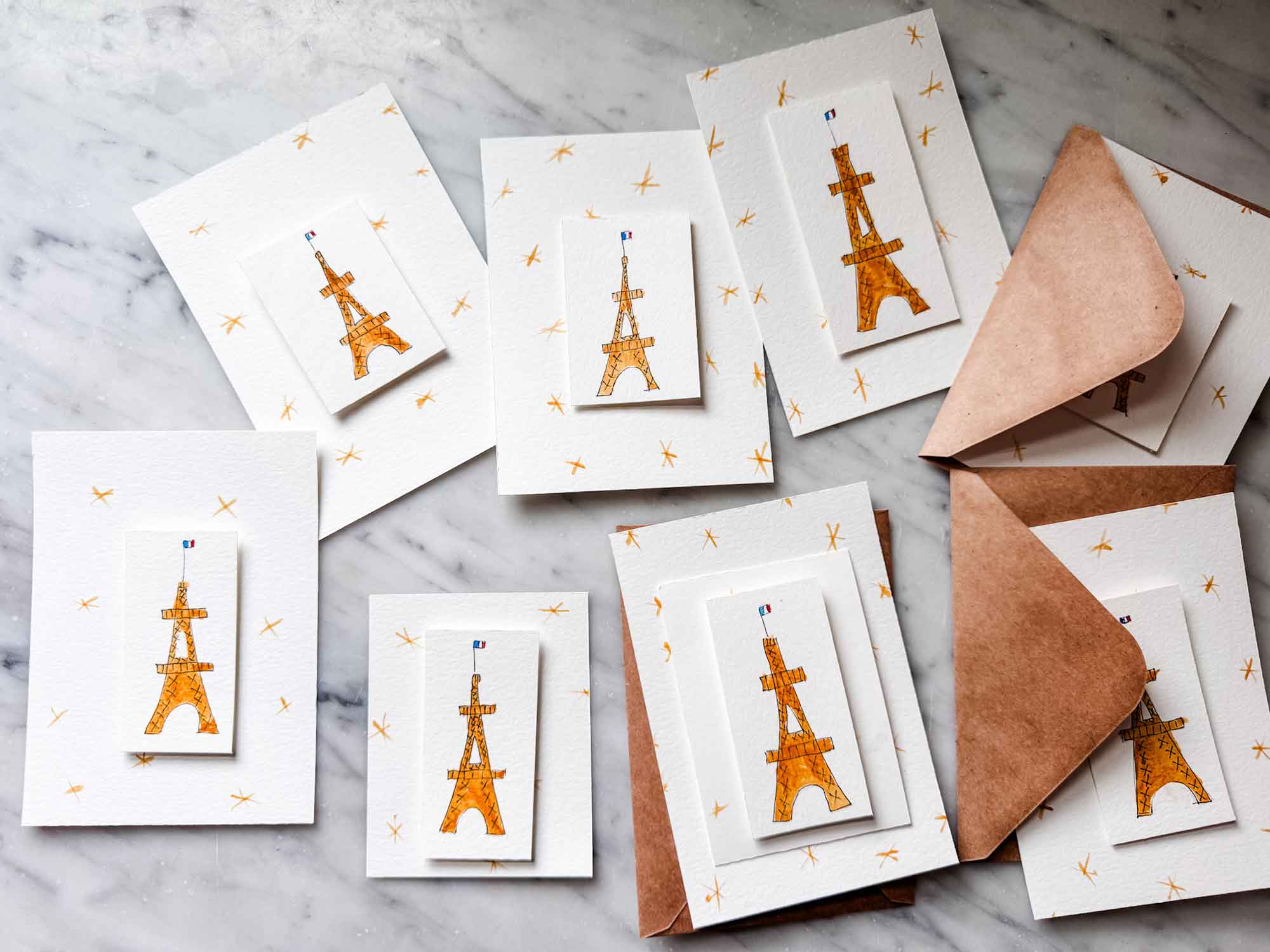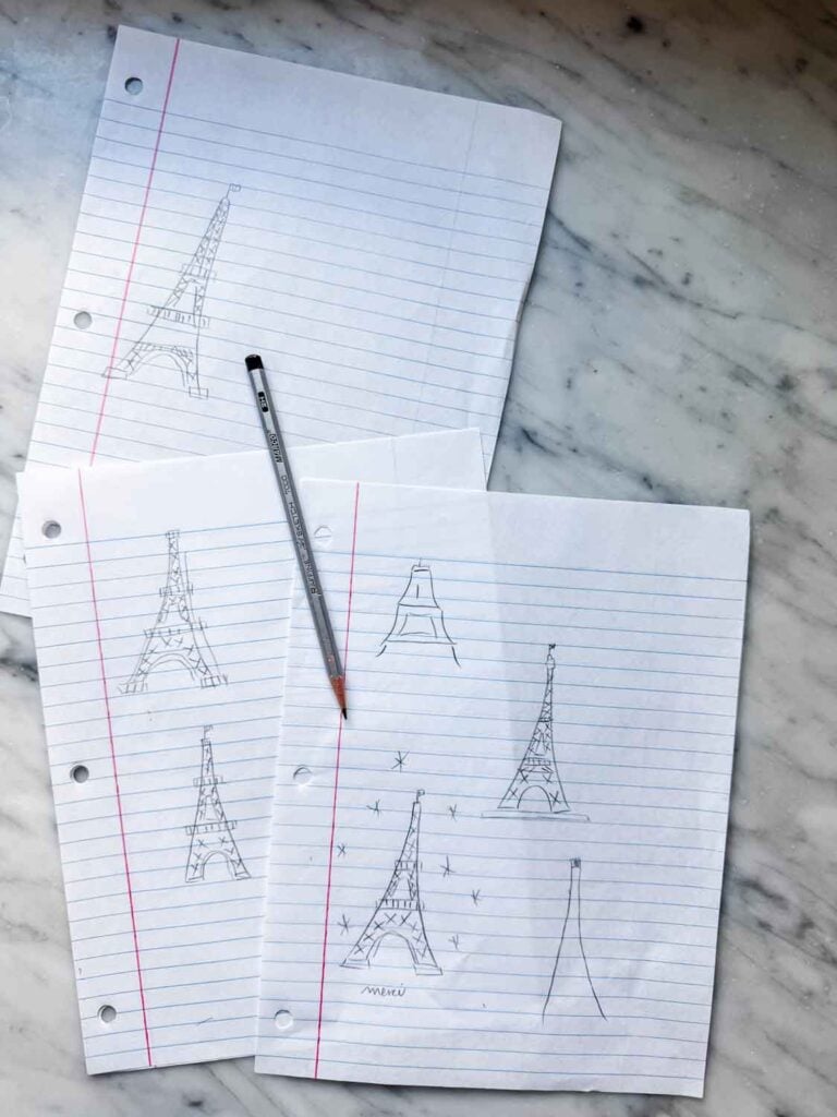Before painting the actual cards, I spent a bit of time practicing. I sketched the Eiffel Tower a few times on scrap paper, getting comfortable with the shape and proportions. Once I felt ready, I lightly drew the tower directly onto the watercolor paper with a pencil, then went back over it with a thin marker: nothing perfect, just simple lines to guide the painting.