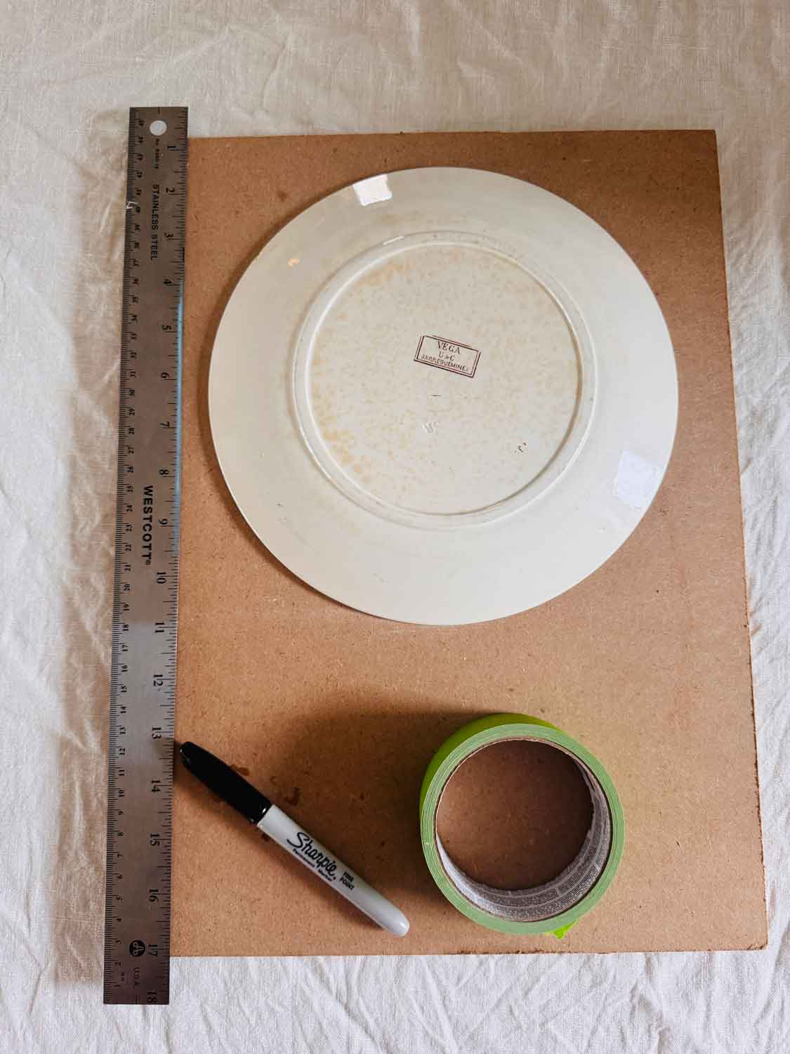 - Place a short strip of painter’s tape vertically over the center. You’ll be able to see the Sharpie mark from the bottom of the plate. Mark the dot again on the painter’s tape.