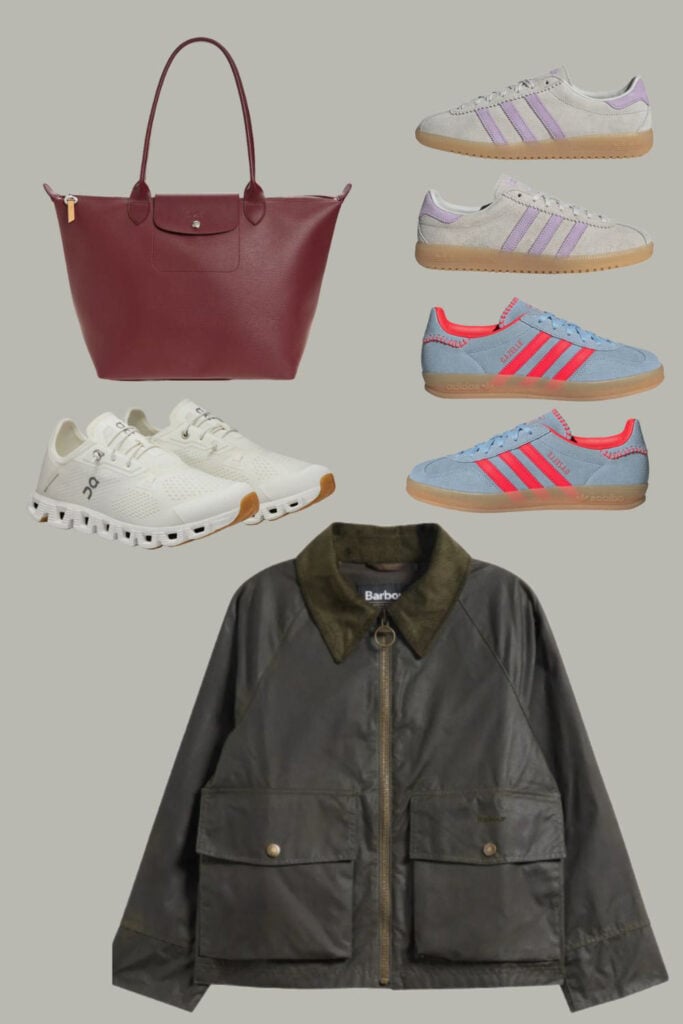 Left: Longchamp Leather Tote // Adidas Sneaker // Adidas Sneaker // On Cloud 5 Coast Sneaker // Barbour Jacket // Right: Oversized Cotton Pajamas (Blue) // Natori Bra // Hanky Pank Original Rise Thong // Hanky Pank Boyshorts // Stripe Hydrocotton Terry Robe // Classic Short Cotton Pajamas (Gingham)