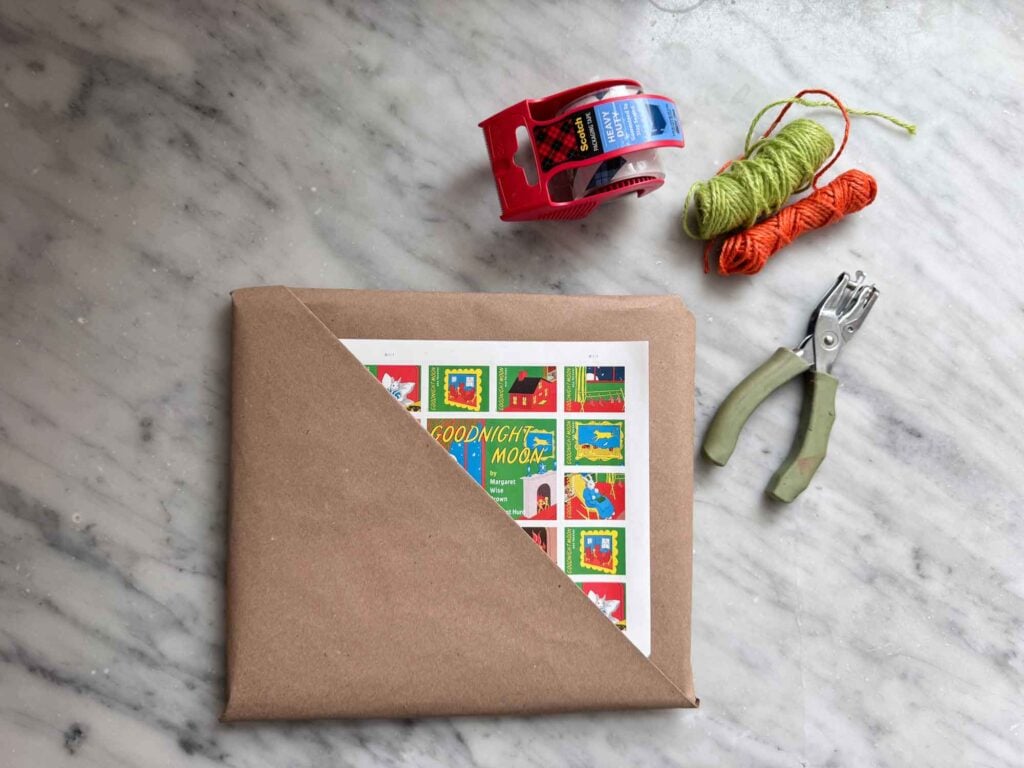 Now fold the right side into a triangle. This is forming the pocket. Crease the edge and fold over the book. Turn over and wrap each end as you would for a normal gift wrap. Secure with tape; if using heavy kraft paper, you may need to use heavy-duty packaging tape.