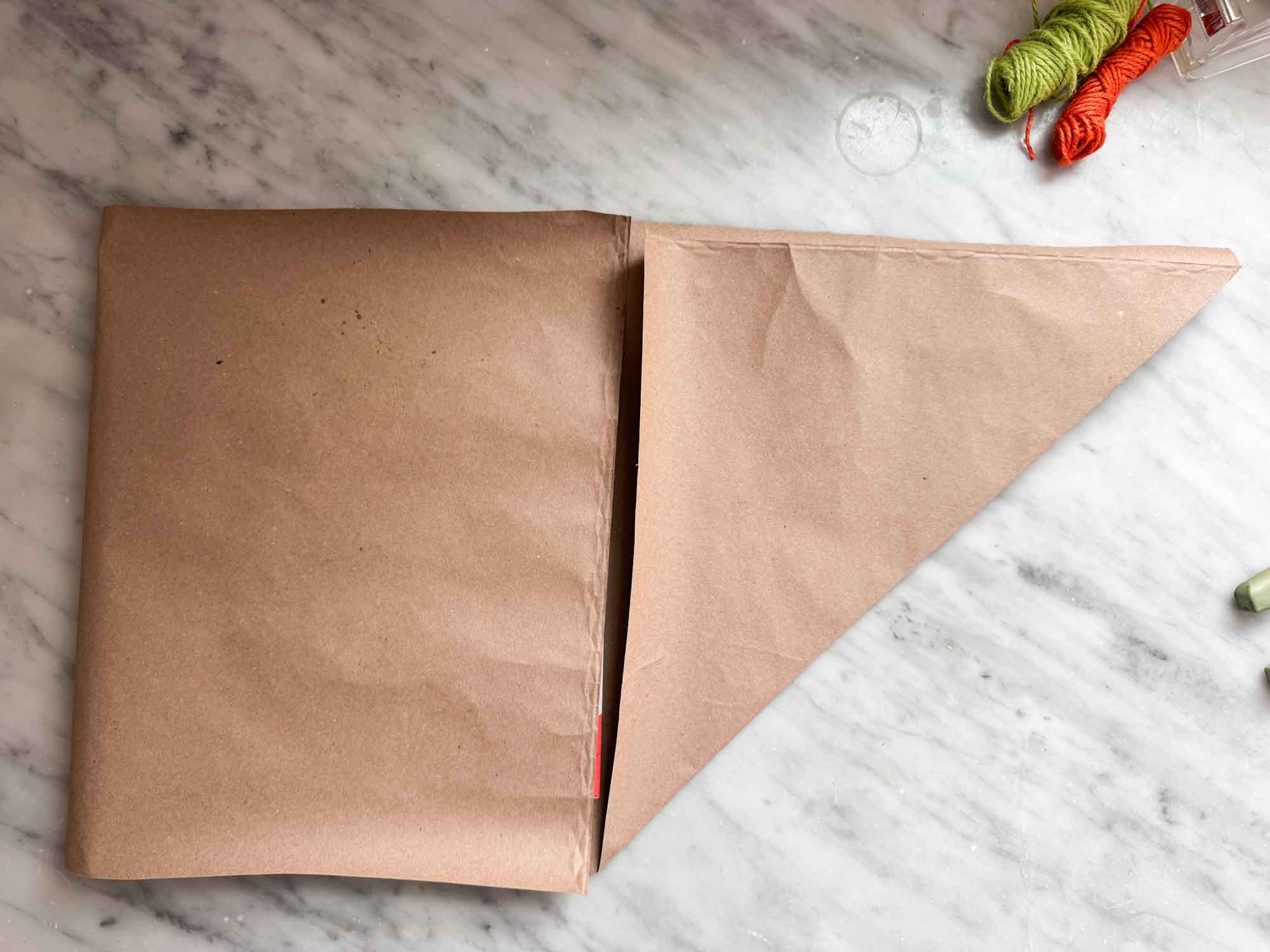 Now fold the right side into a triangle. This is forming the pocket. Crease the edge and fold over the book. Turn over and wrap each end as you would for a normal gift wrap. Secure with tape; if using heavy kraft paper, you may need to use heavy-duty packaging tape.