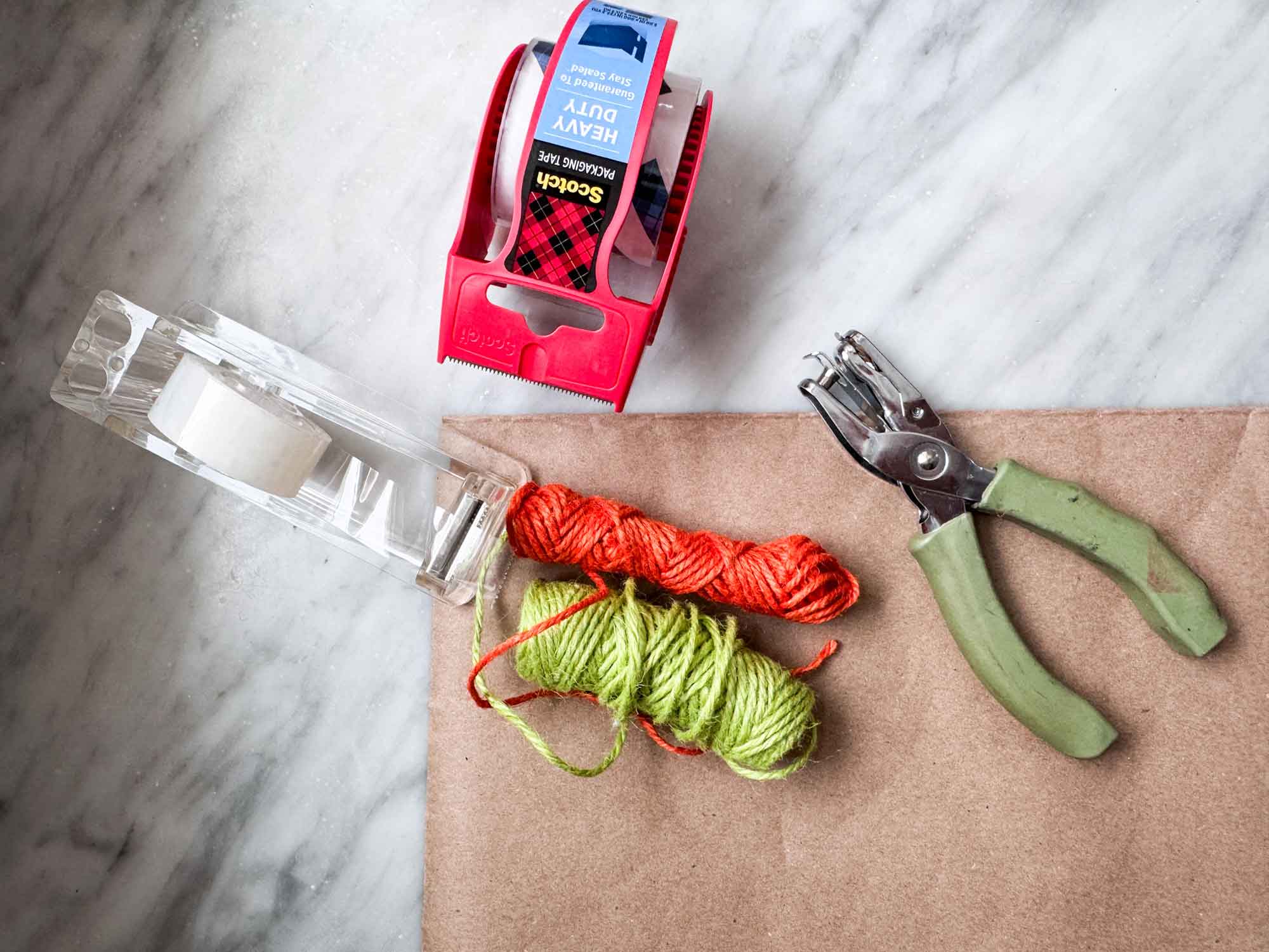 Start at the bottom, thread the twine from inside, and then lace it through the holes to the top. Once you get to the top, take the twine and move down to the bottom, tucking it in and entering the first hole again to be able to tie a bow. Trim the tape off the end.