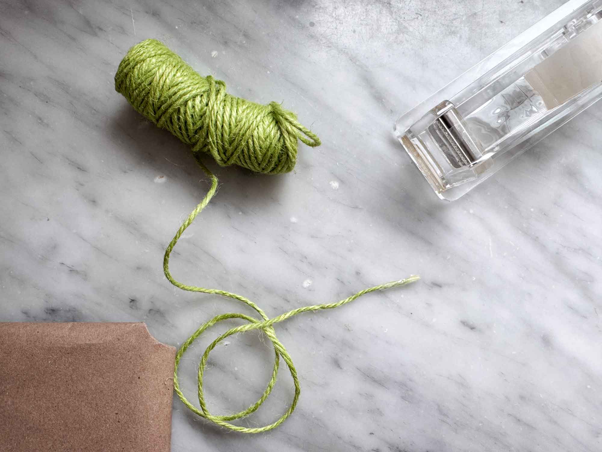 Add a piece of tape to the end of the twine. This will make it easier to thread through the holes.