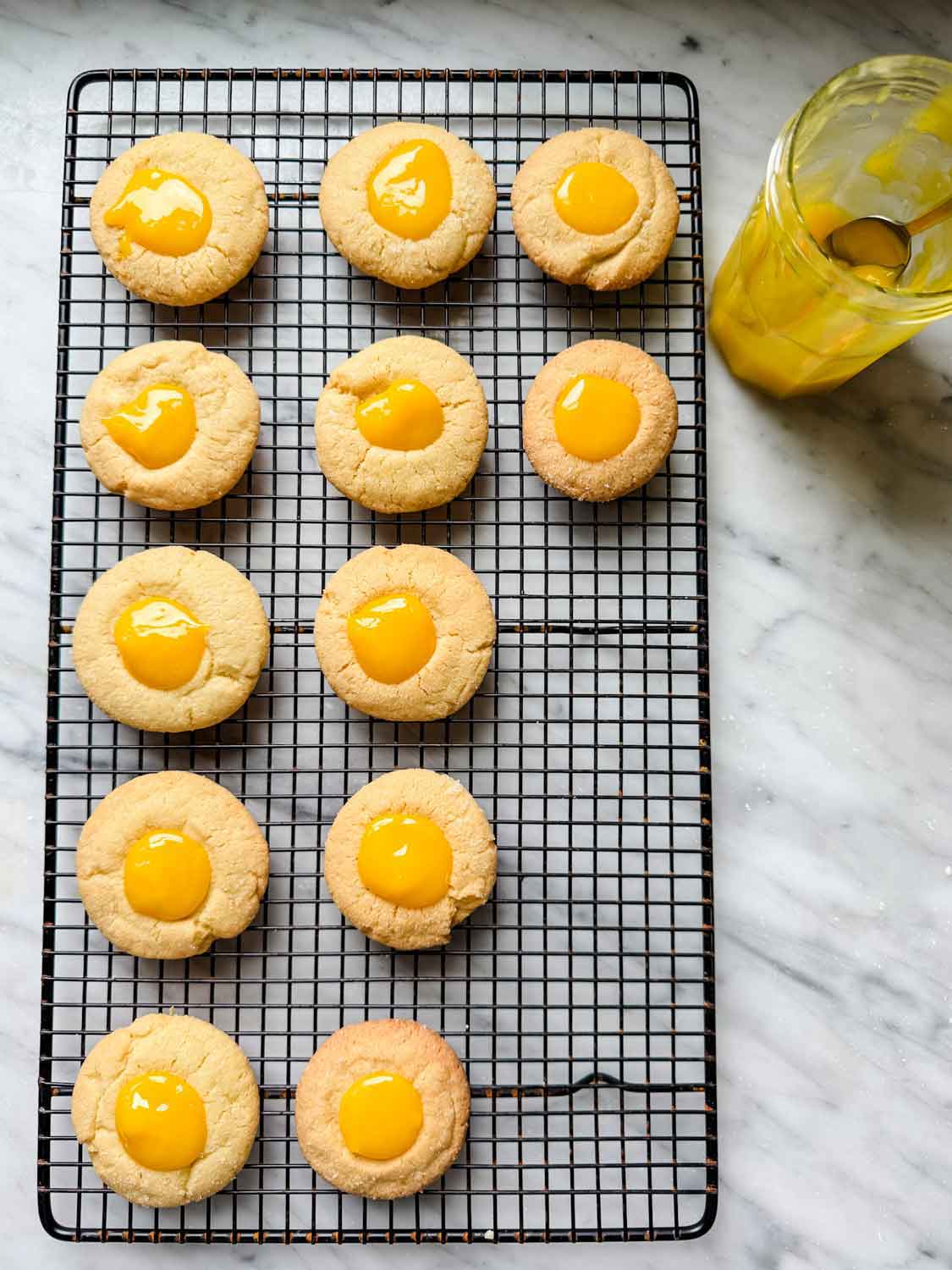 You can use a good store-bought version, but if you have the time to make the lemon curd from scratch, it’s well worth it. Homemade lemon curd has a noticeably fresher flavor with a vibrant tang that’s hard to replicate. The texture is also completely different. It’s silky and creamy rather than gelatin-like. I compared my homemade version to Bonne Maman and Trader Joe’s, and the difference was striking. The homemade curd has a bright, beautiful yellow color, while the store-bought versions tend to be more pale with a slightly jelly-like consistency. When used in thumbprint cookies, the difference in flavor, texture, and color of lemon curd really stands out.