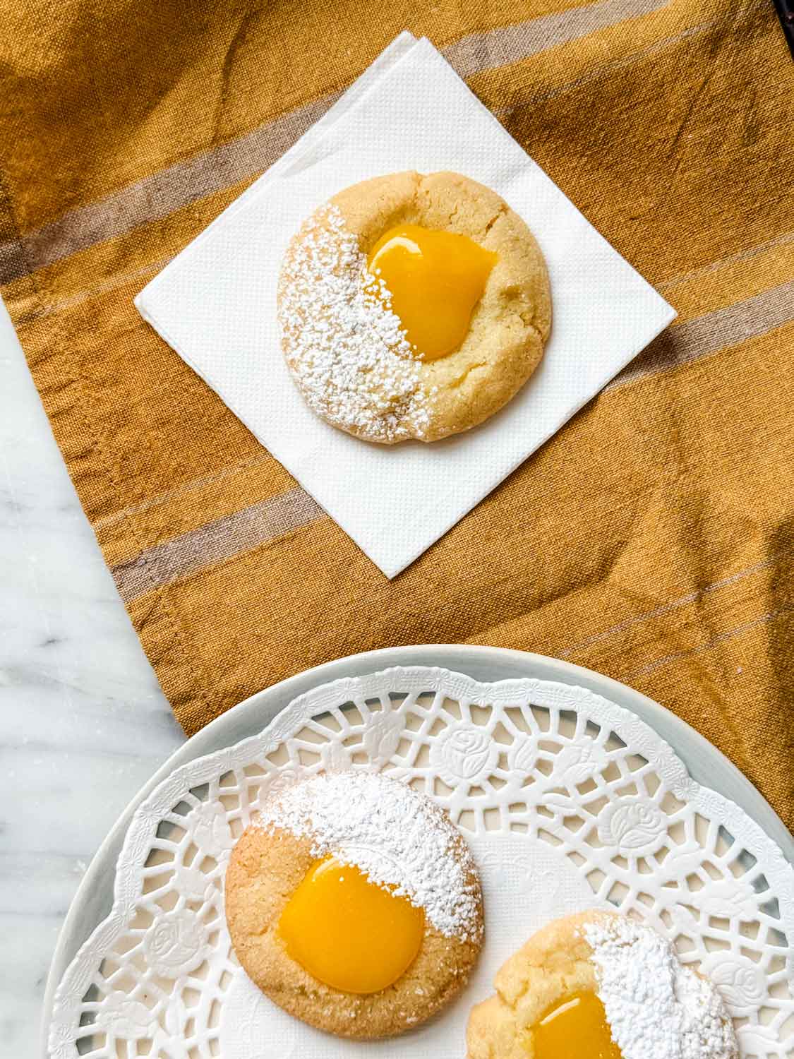 For a simple finishing touch, I like to dust half of each cookie with powdered sugar. It’s a small detail, but it adds a bit of contrast and makes these lemon curd thumbprint cookies feel just a little more special. To do this, place a small piece of cardstock or cardboard over half the cookie, then lightly dust the exposed side with powdered sugar using a fine mesh sieve. It takes just an extra minute, but gives them a lovely, bakery-style look.