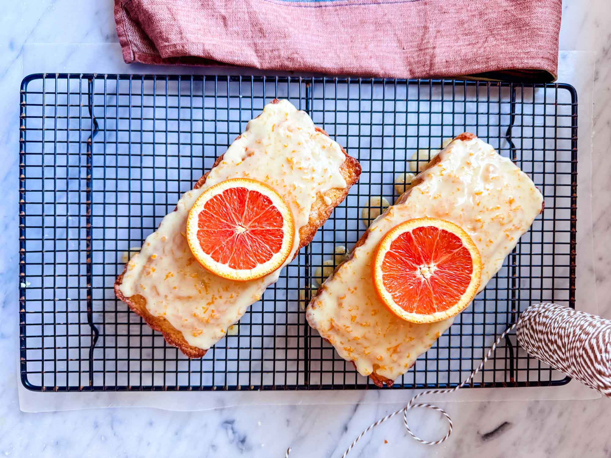 To make the glaze, mix powdered sugar and the juice and zest of one orange. Spread on top of cakes.