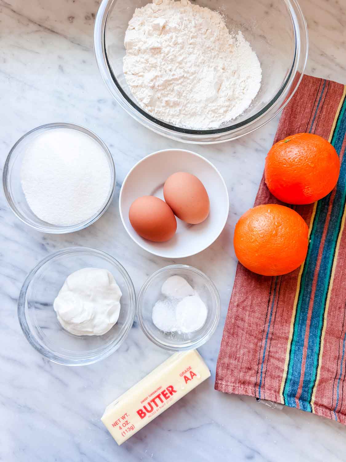 To make the glaze, mix powdered sugar and the juice and zest of one orange. Spread on top of cakes.