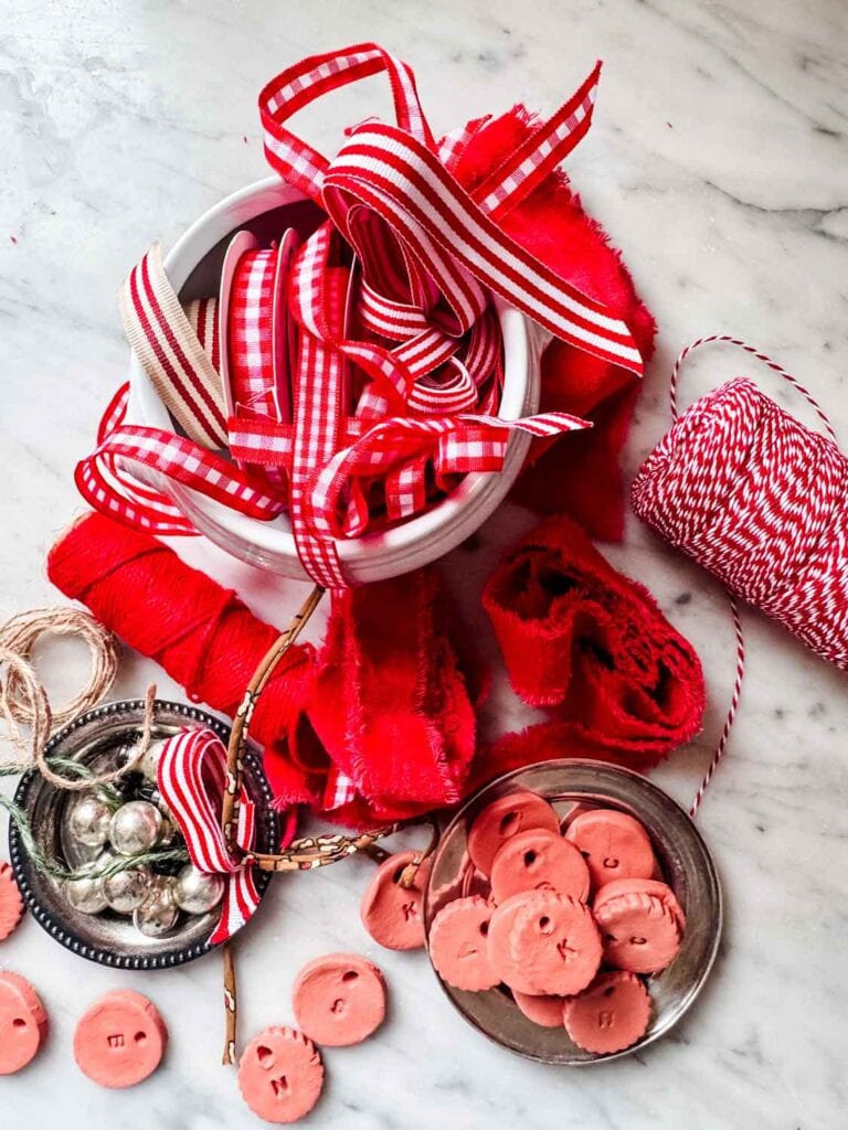 Air-dry overnight (or longer if they’re thick). Or, if you are impatient like me, put them on some parchment paper on a baking sheet and bake for 30 minutes at 200º. Once dry, you can lightly sand the edges if needed. I rarely do this as I don’t mind the imperfections. - Add ribbon