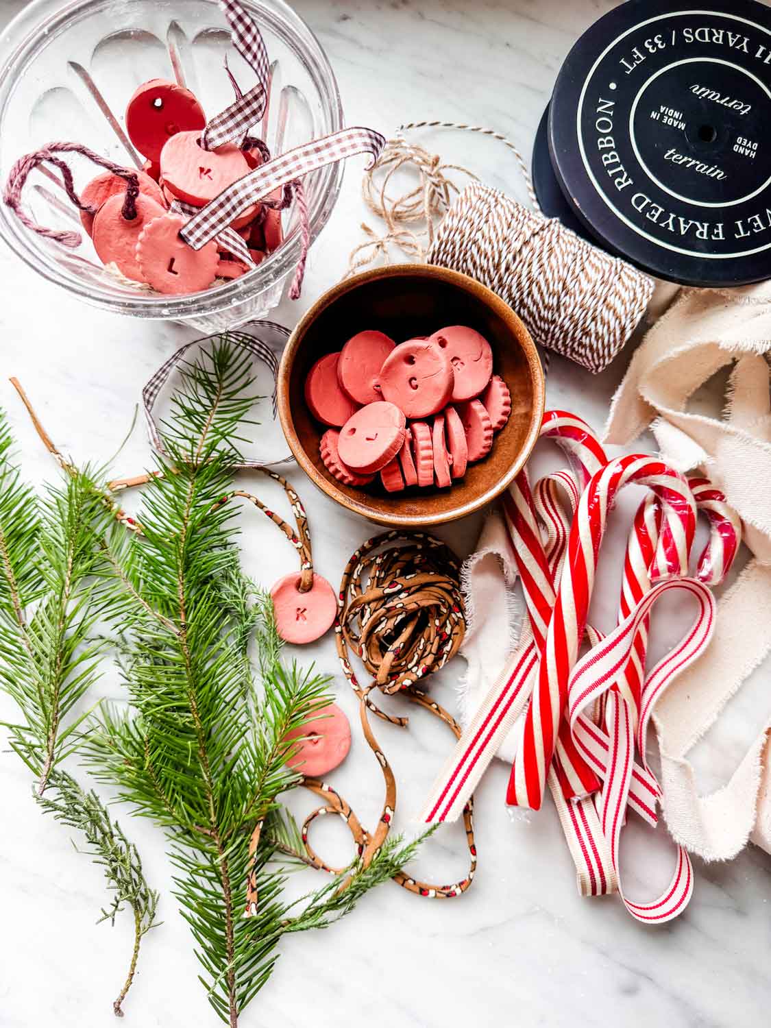 - Sprigs of evergreen, candy canes, baubles
