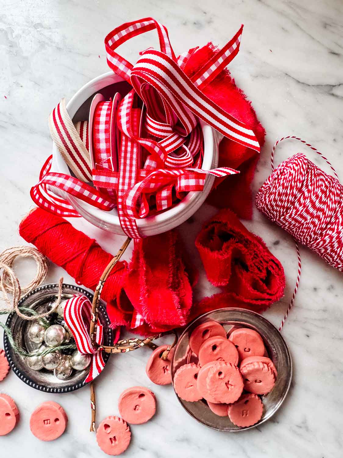Air-dry overnight (or longer if they’re thick). Or, if you are impatient like me, put them on some parchment paper on a baking sheet and bake for 30 minutes at 200º. Once dry, you can lightly sand the edges if needed. I rarely do this as I don’t mind the imperfections. - Add ribbon