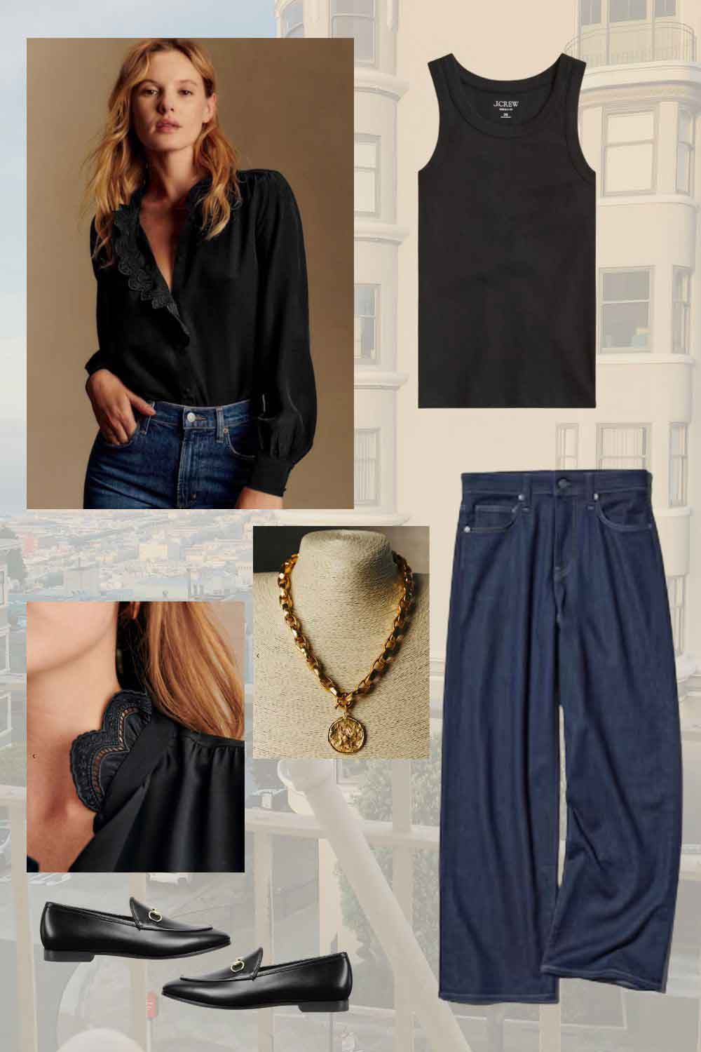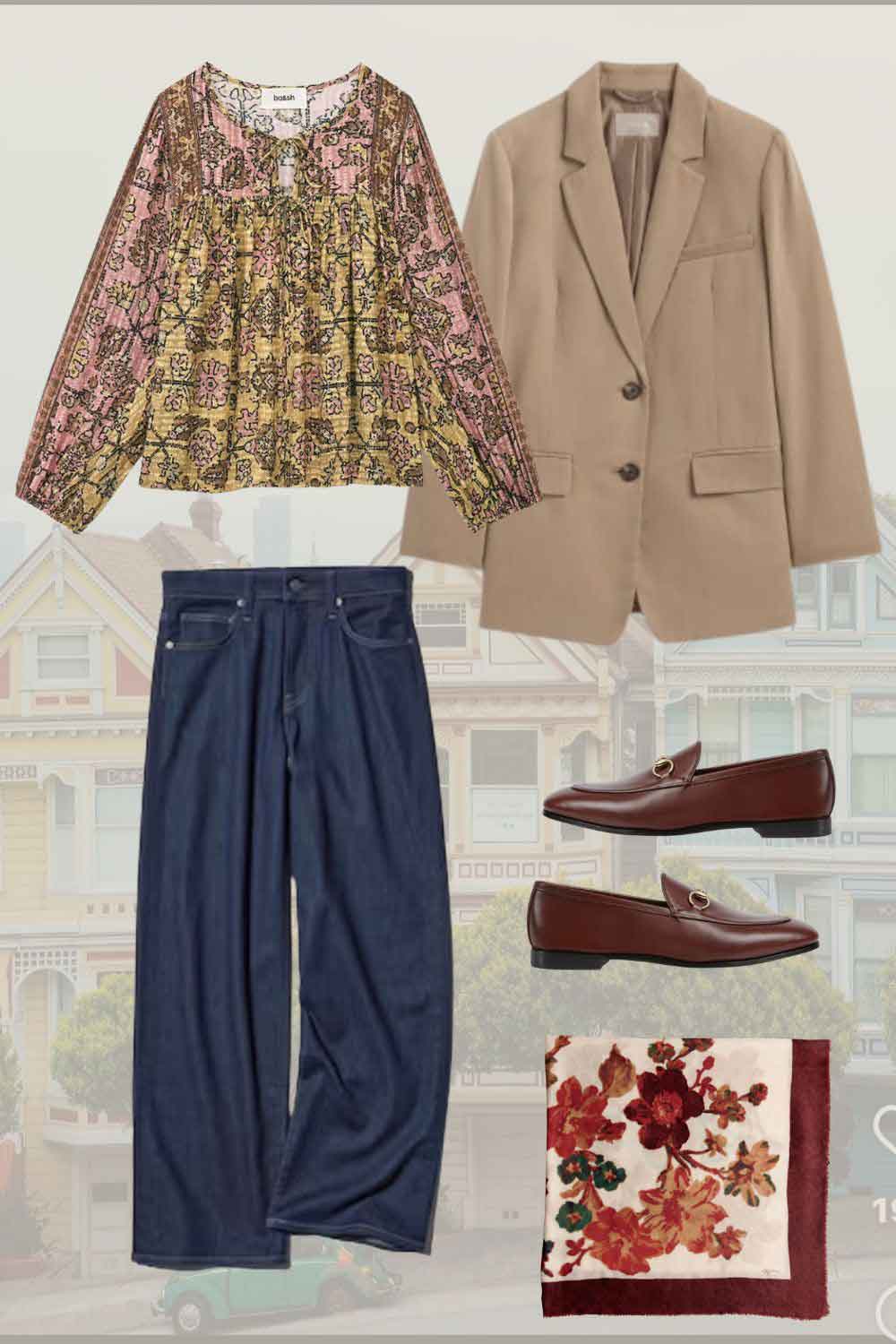 I wore a cotton-print shirt from ba&sh (mine is from a few seasons ago; this one is similar. dark denim trouser jeans, and a blazer. I did buy this oversized blazer from Everlane, thinking that my houndstooth jacket would be too wintery. Turns out, it wasn’t, but the Everlane blazer is a great transition jacket, and it’s on sale in this color. (Runs true to size). For shoes, I wore brown Gucci loafers.