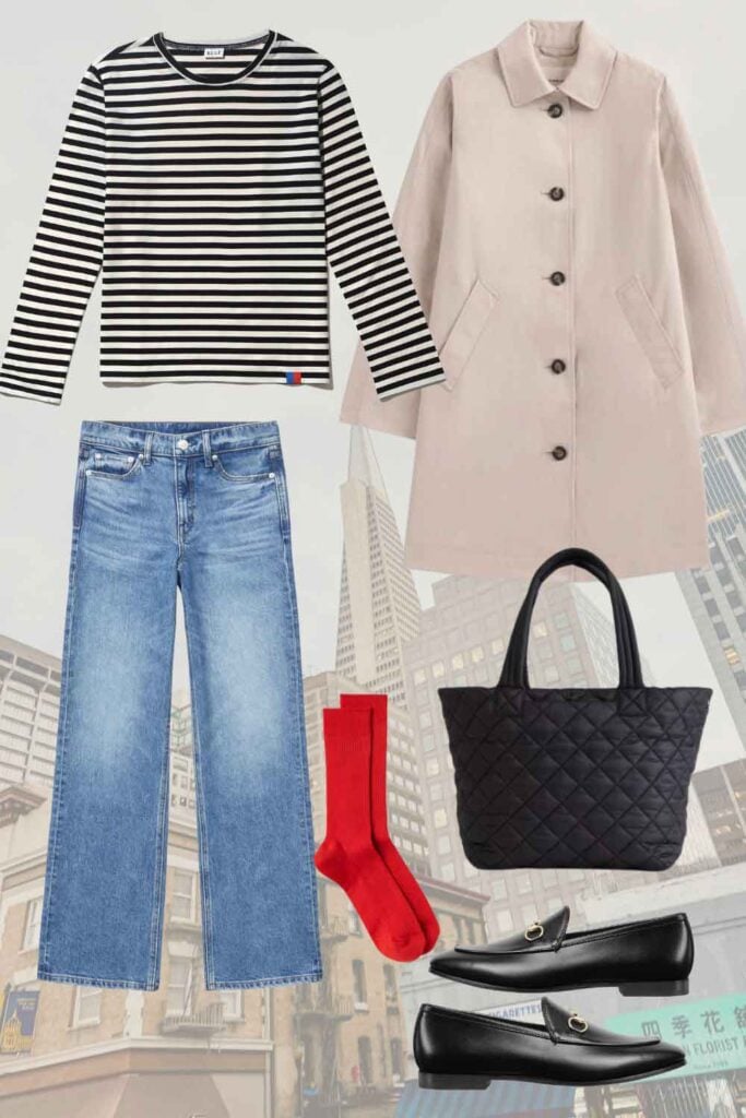For a long travel day, I wore my favorite pair of jeans from AYR. Mary Ann and I both wore them on our travel days. They are super comfortable, don’t stretch out between wearings, and they come in three lengths, so you can get the perfect fit. I wore this long-sleeve stripe Tee from KULE with a Uniqlo thin puffer vest under a simple trench from Everlane.