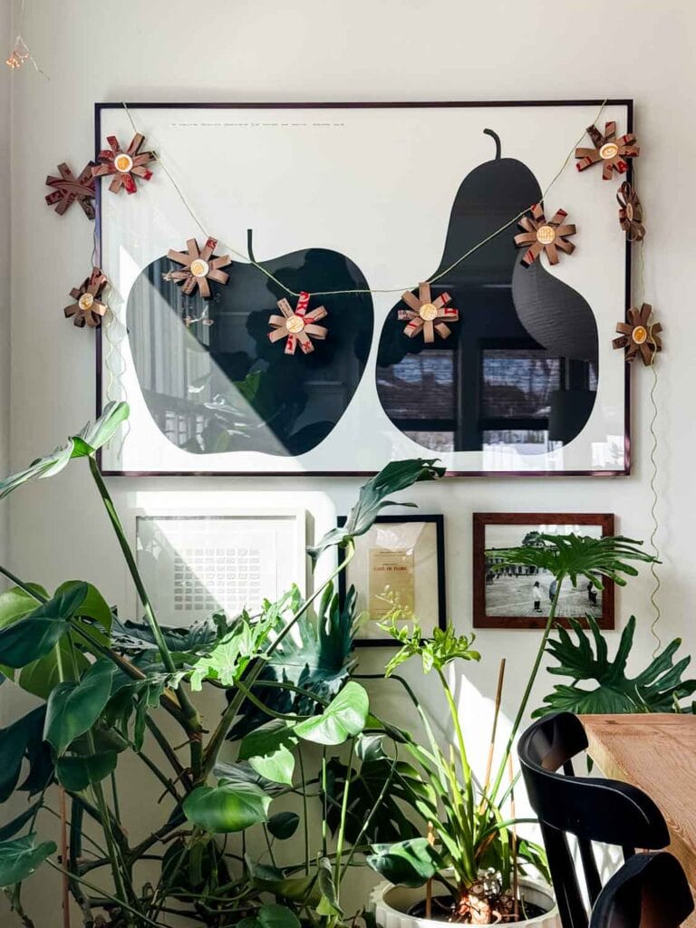 It’s sweet, hung across a kitchen window or draped on my modern black-and-white Enzo Mari Apple Pear poster.