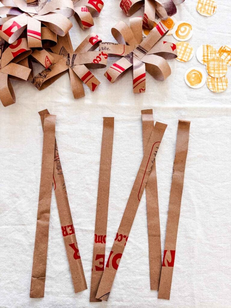 Cut the Trader Joe’s bag into strips about 1/2 inch wide. Some of mine include the red and brown lettering of the graphics, which adds a little interest. Others are just plain brown — I like mixing both.