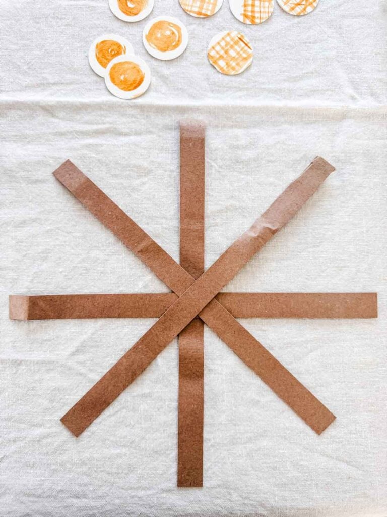 Layer the strips in a starburst pattern, overlapping them in the center. Staple right through the middle to secure them.