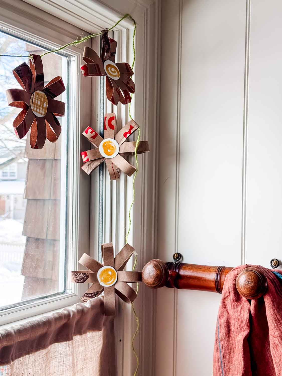 The flowers are made from strips of the paper bag, and the centers are just watercolor circles. It’s simple, a little nostalgic, like something I would have made with my kids on a snow day when they were little.