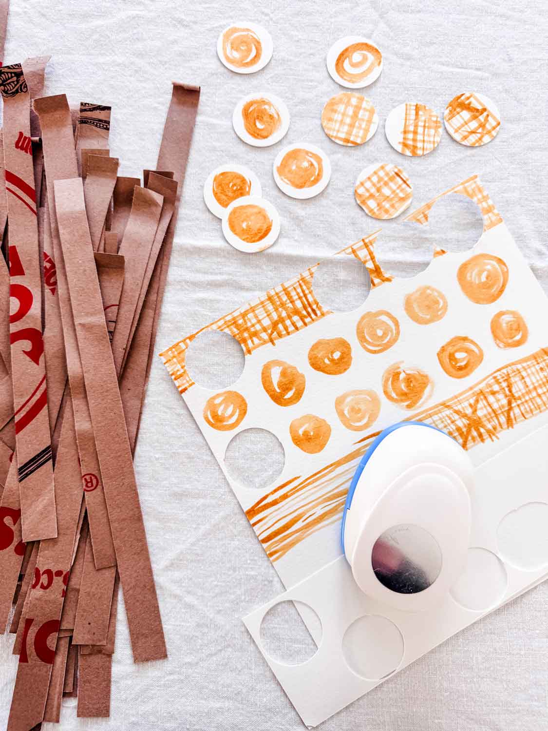 A simple paper flower garland made from a Trader Joe’s paper bag and hand-painted watercolor circles — an easy, charming craft that turns everyday materials into something unexpectedly sweet.