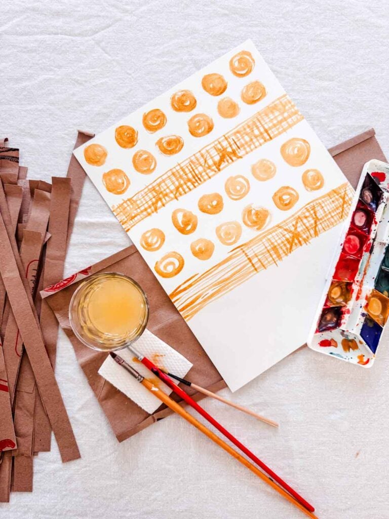 Start by painting loose watercolor circles on white paper. Don’t overthink them — just simple swirls, dots, or even a little crosshatch pattern. I stayed in warm gold tones, but you could use any color and mix it up.