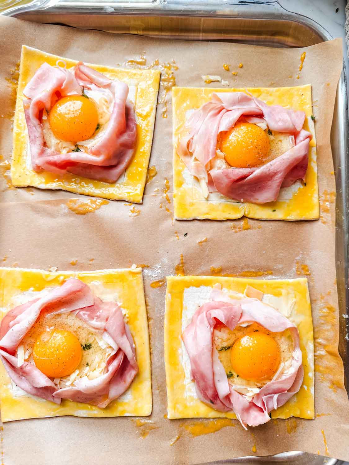 You can bake the puff pastry with everything but the egg for 10 minutes, and then add the egg and bake for another 10 minutes. I prefer adding the egg and baking everything together for approximately 18 minutes.