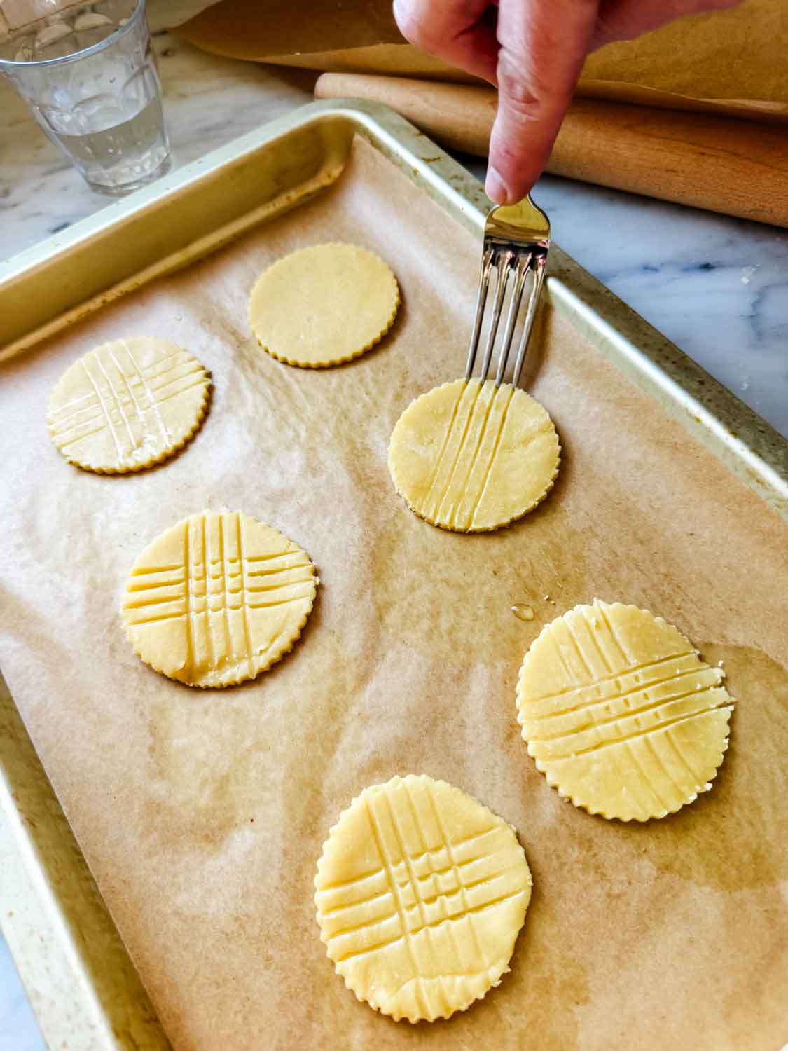 - Using the tines of a fork dipped in water, drag the tines vertically and horizontally over the top of each cookie.