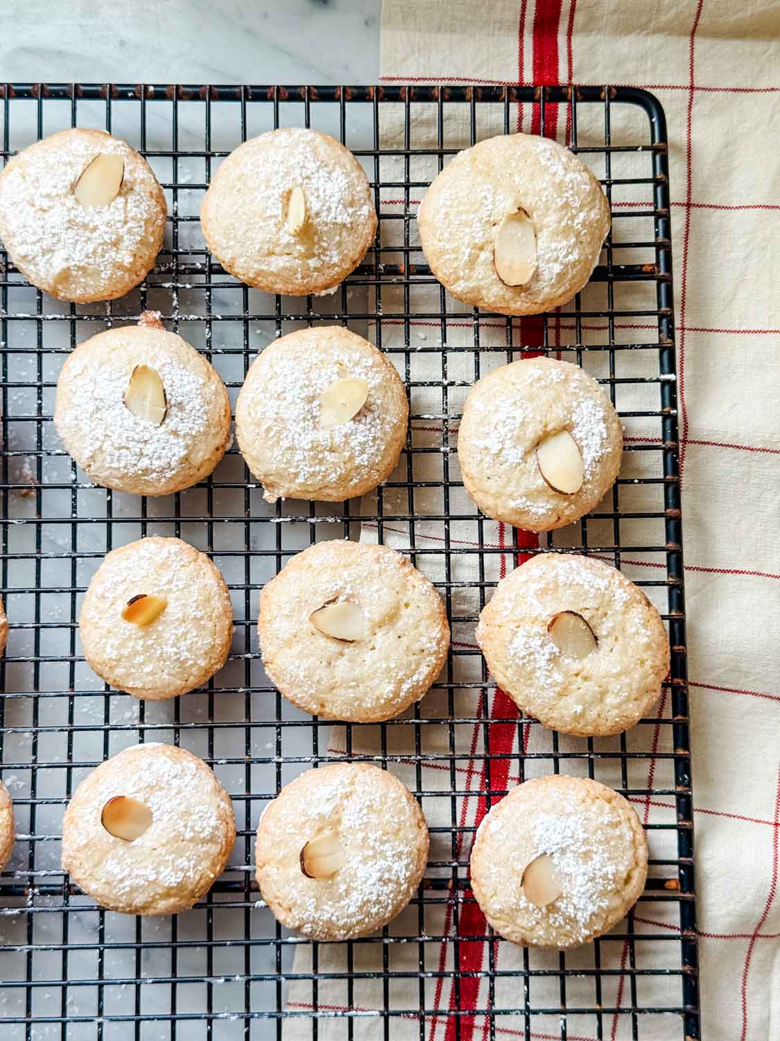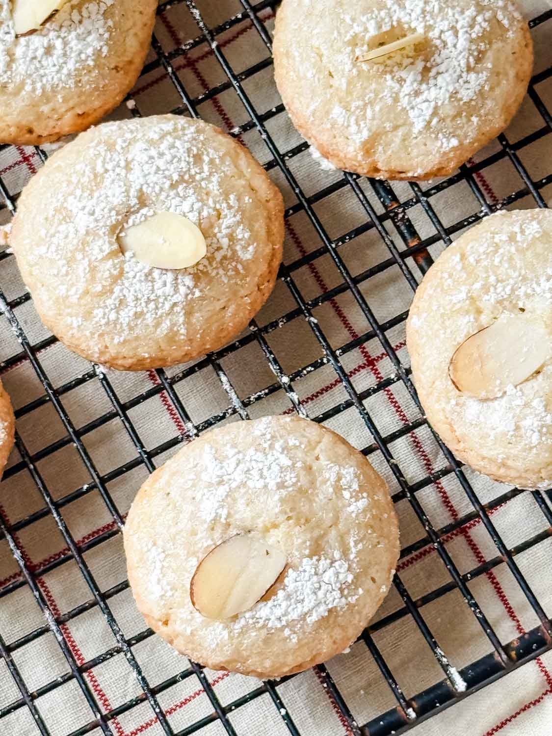 - Using a fine mesh sieve, dust generously with powdered sugar. If using, place a slivered almond in the center of each cookie.