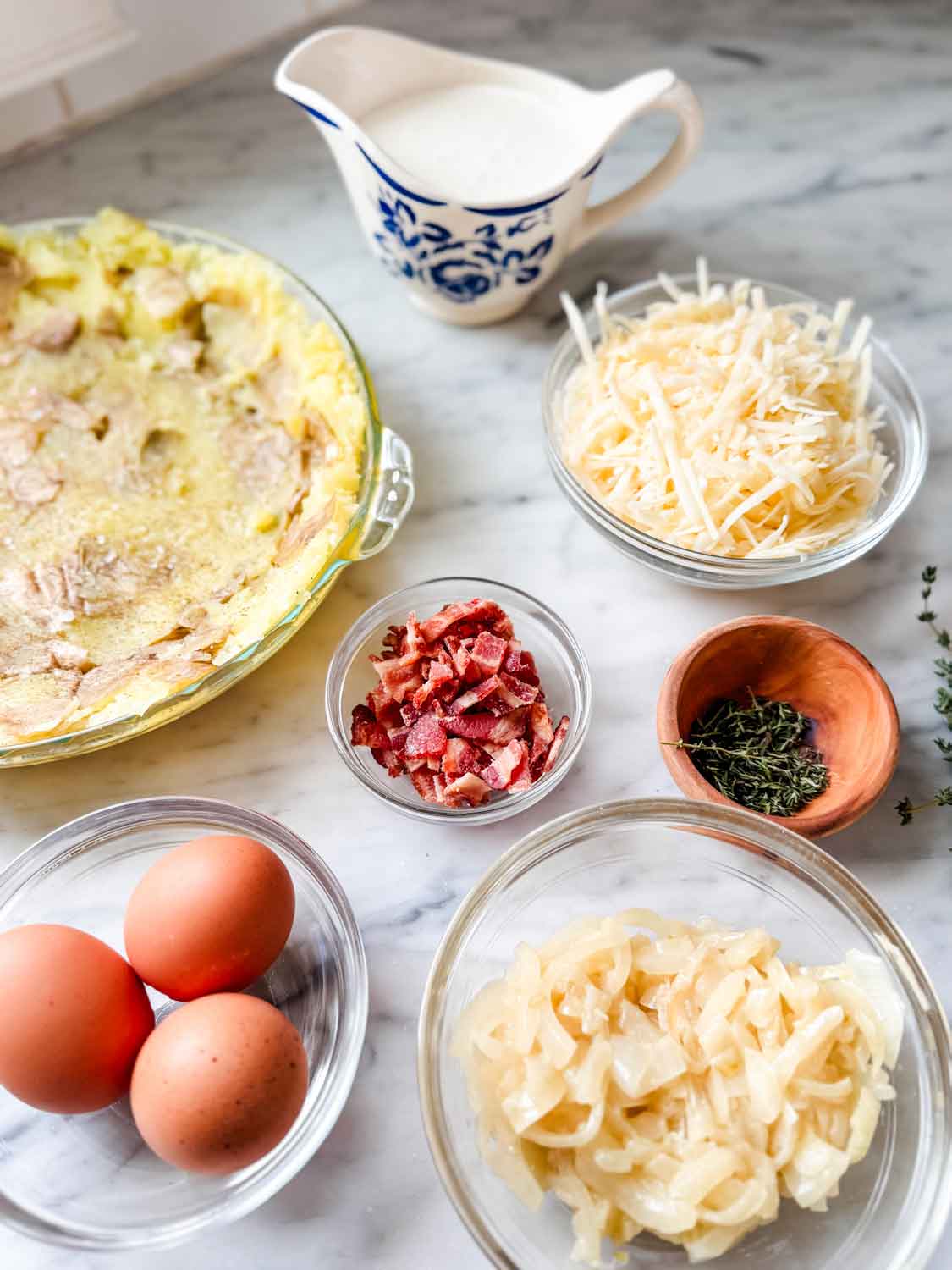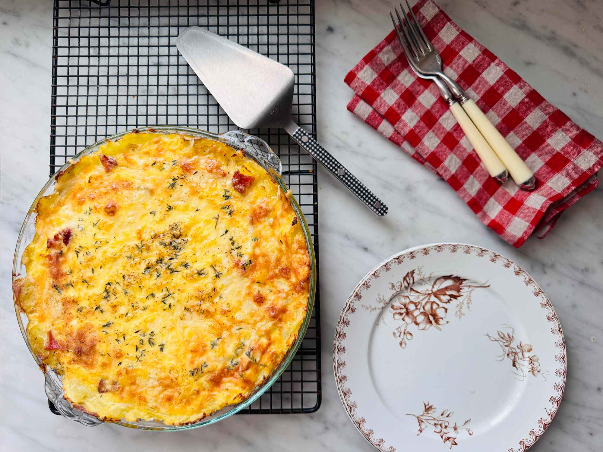To prepare the potato crust, place the potatoes in a pot with cold water that covers them by about an inch. Bring to a boil, then add about 1 1/2 tablespoons of salt and reduce the heat to medium. Cook potatoes for about 30 minutes or until fork-tender. Drain and then add to a buttered pie dish. Sprinkle again with generous salt and some fresh ground pepper, then, using the flat bottom of a glass, smash the potatoes into the dish and up the sides like you would a pie crust.
