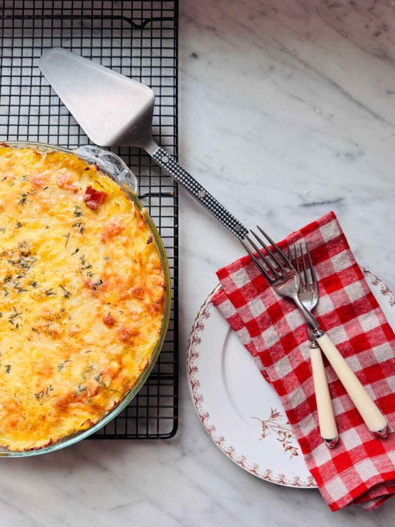 Adding a smashed potato crust, especially in winter, just seems extra cozy. You could use any quiche recipe you like, but Ina Garten’s quiche with egg, Gruyère, fresh thyme, and bacon filling is our favorite. It’s a perfect cozy winter brunch, lunch, or even dinner recipe paired with a simple green salad.