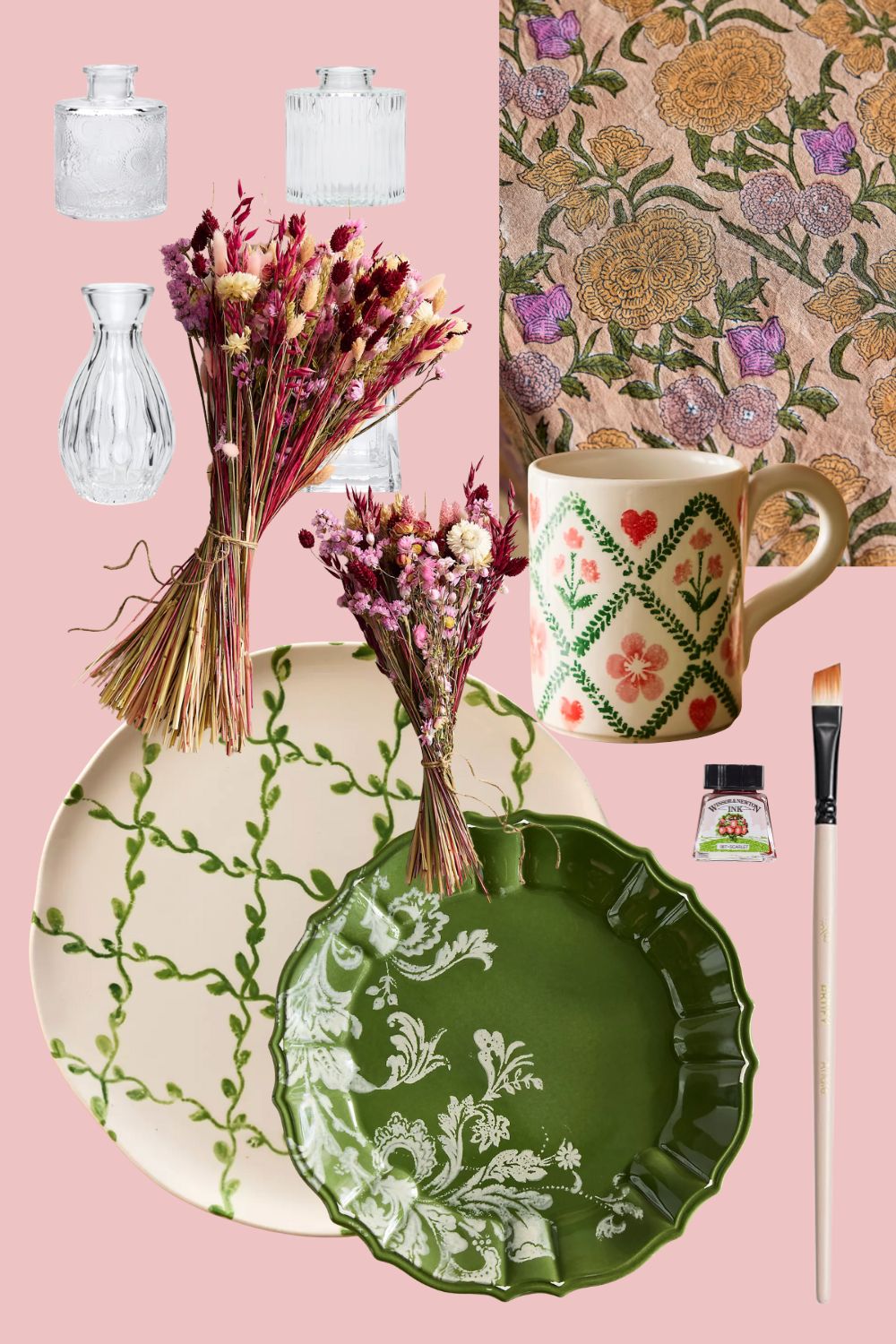 Mini Clear Vases // Dutch Field Mixed Bouquet // Floral Tablecloth // Valentine Lattice Earthenware Mug // Vine Lattice Plate // Botanical Silhouette Side Plate // Drawing Ink