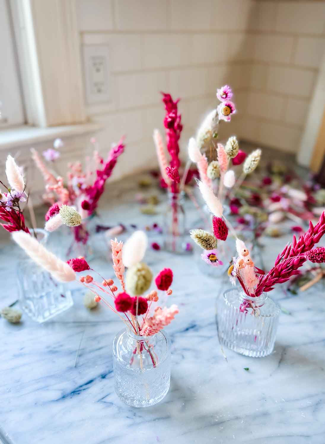 Small vases and some dried flowers would be a fun activity for a children’s Valentine party. Each child could make their own mini arrangement, and some homemade Valentine’s.