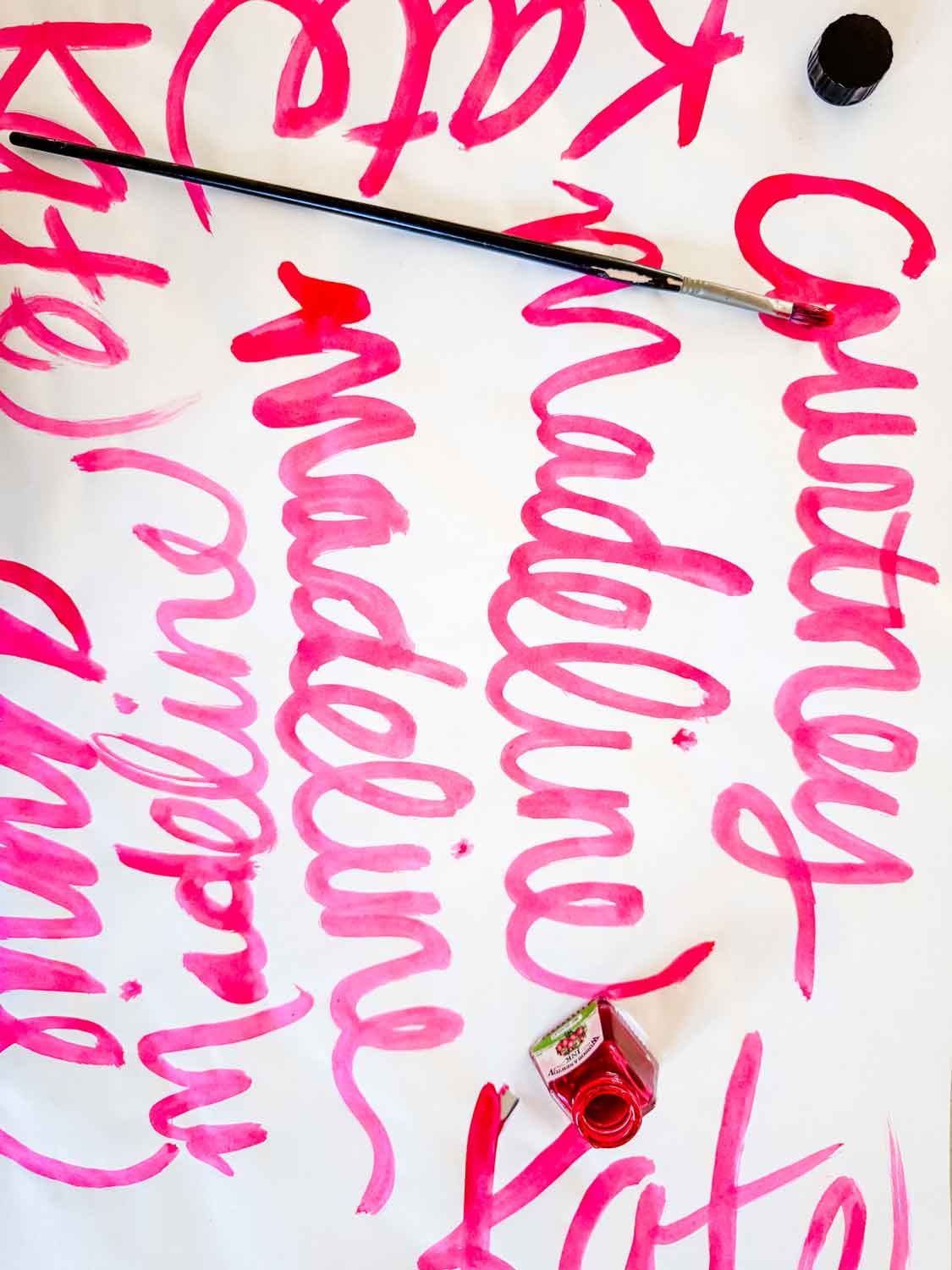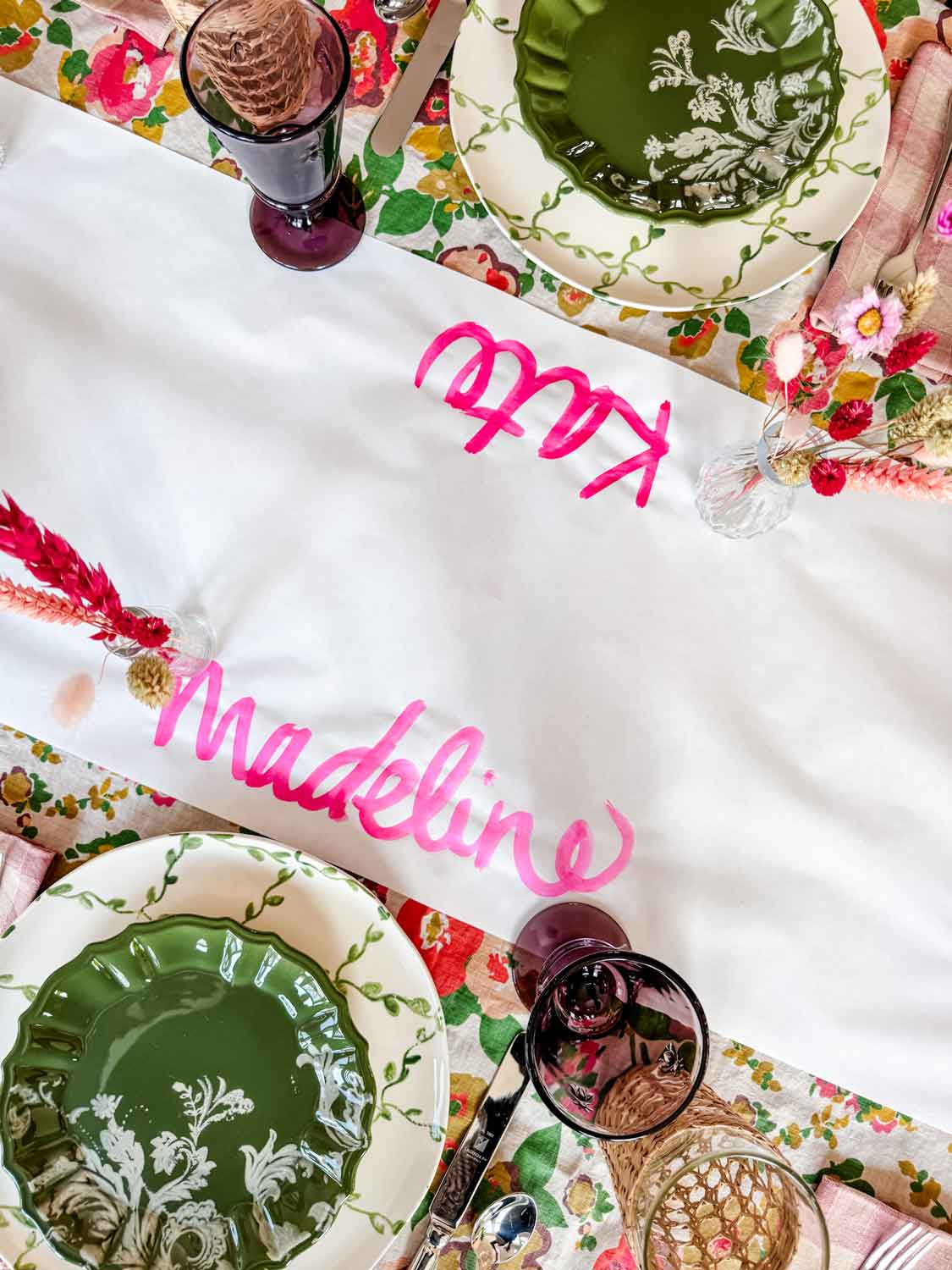Once the runner was in place, I brought out a small jar of pink ink and a paintbrush and started writing each guest’s name directly onto the paper. I’m no calligrapher, but that’s part of the charm. I practiced a little first. It all feels relaxed and personal, and it lets everyone know the table was set just for them. The butcher paper becomes part place card, part decoration, and part keepsake (I’ve had friends ask if they can take a section home before I even clear the plates).