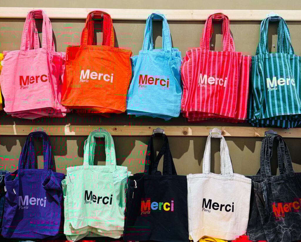 One of our favorite shops in Paris is Merci in the Marais. They also have a new location in the 1st arrondissement (known as the historic heart of Paris) on Rue de Richelieu. Both shops have a colorful display of the popular Merci Tote Bags. The totes make a fantastic present, and they’re easy to bring along since they fold flat.