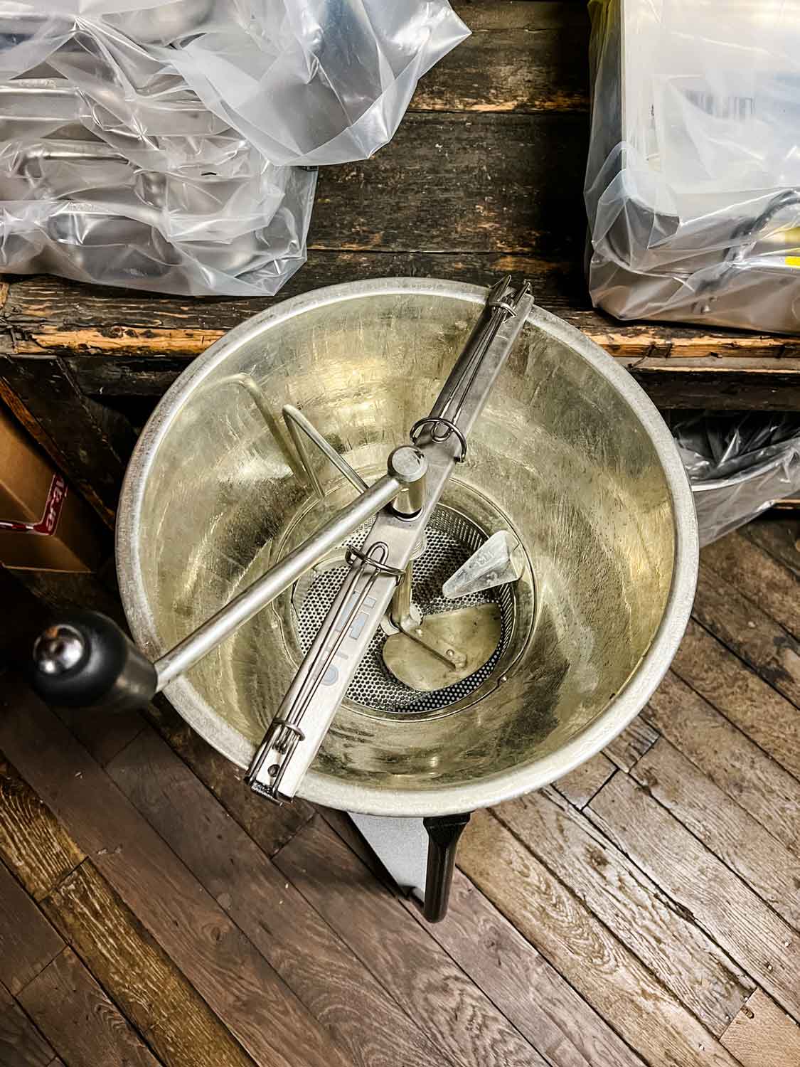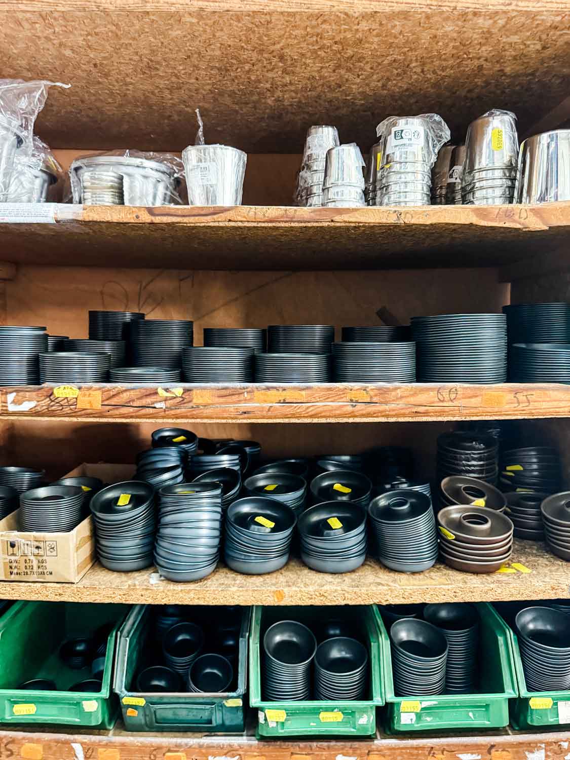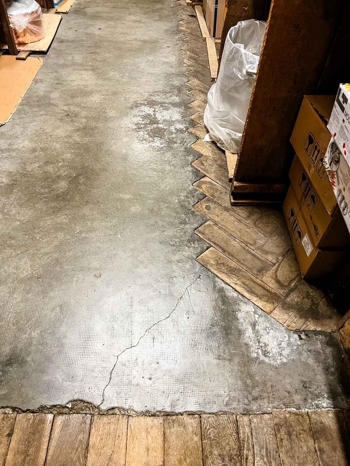 In the basement, the concrete floors blend with old, worn wood flooring. You wander down aisles that abruptly come to an end. Boxes of every kind of pot, pan, food mill, and other kitchen supplies line the shelves. The entire feel of the store is unfinished in a deliberately organized and finished kind of way.
