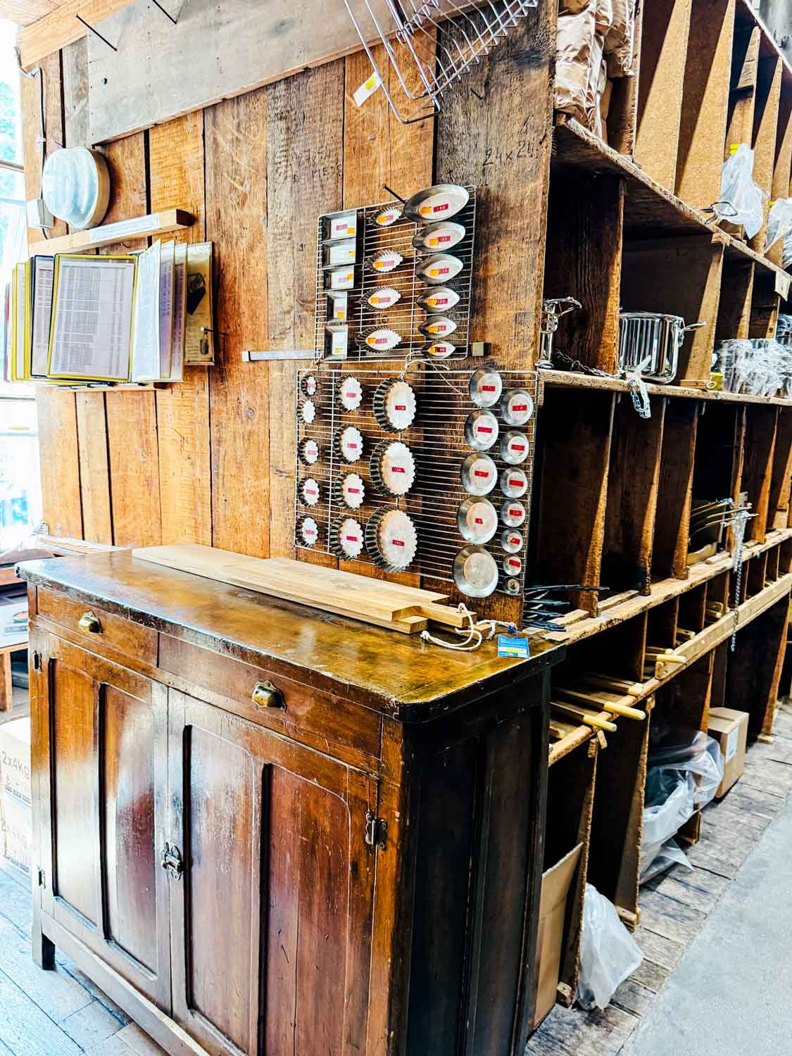 I think the most charming thing about E. Dehillerin is that it feels like a working kitchen supply store rather than a curated boutique. Old wooden shelves run from floor to ceiling with every imaginable cooking tool. The aisles are narrow, really narrow. Which gives it an intimate kind of vibe. You’ll find copper pots, boxes and boxes of Staub Pots, kitchen whisks in all sizes, an assortment of tart tins (more than you ever knew existed), a large selection of other kitchen utensils, and baking pans in every size and shape.