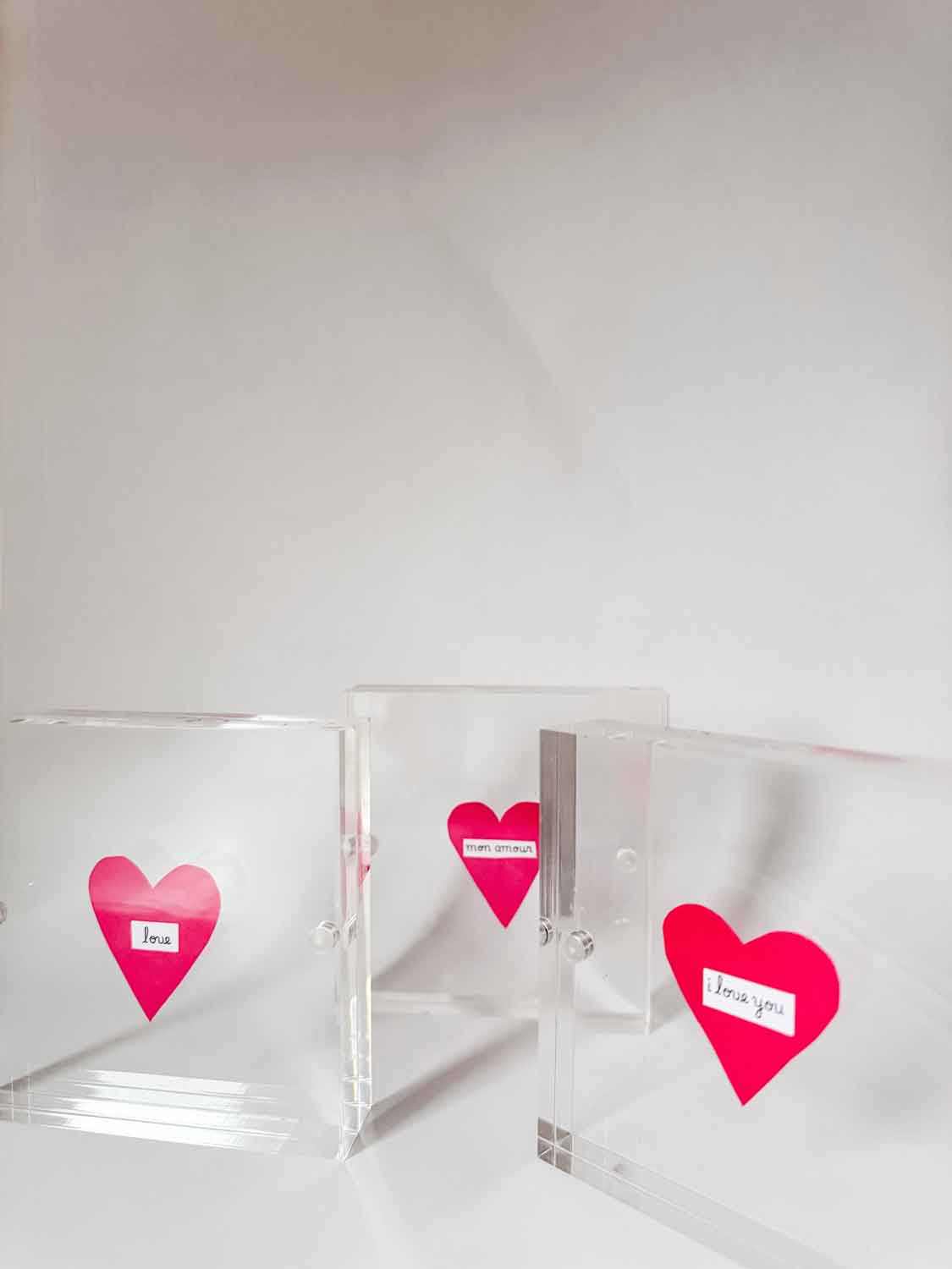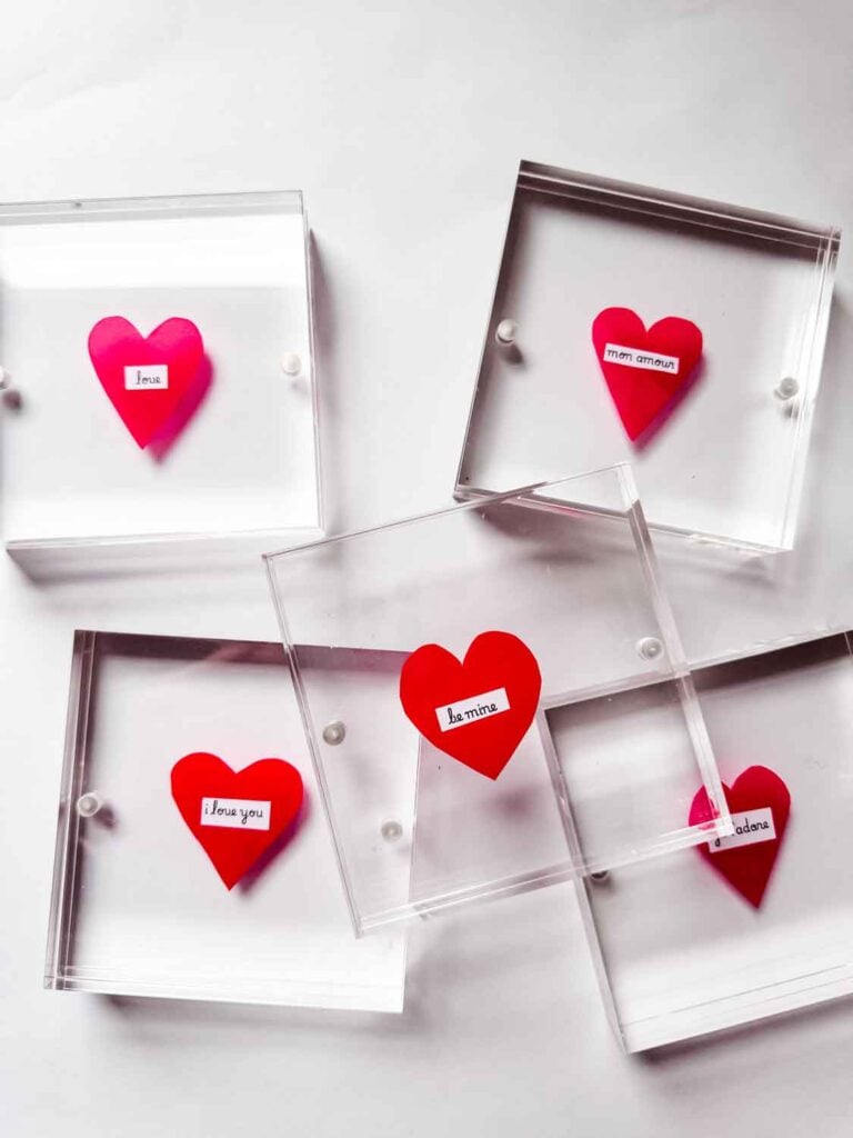 I found a few small acrylic frames and kept everything else very simple: paper hearts, a few words, and a bit of time at the table. That’s it. I love projects like this—easy to make, easy to personalize, and easy to tuck onto a shelf or nightstand once February has passed.